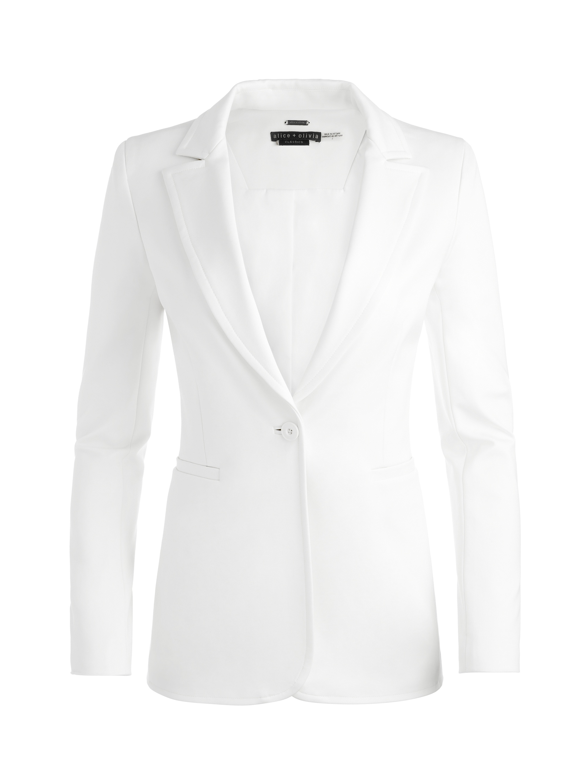 Our signature slim-cut blazer quickly elevates your look to boss babe status. This one screams closet staple. DETAILS - Fitted blazer - Full length - Shoulder pads - Notch collar - Single button closure - Back vent - 65% viscose, 30% nylon, 5% elastane - Dry clean only - Imported FIT - Model is wearing a size 2 and her measurements are 5’10”, 32” bust, 23” waist, 34” hips - Length from the shoulder: 29" - Runs small, size up for a more oversized fit