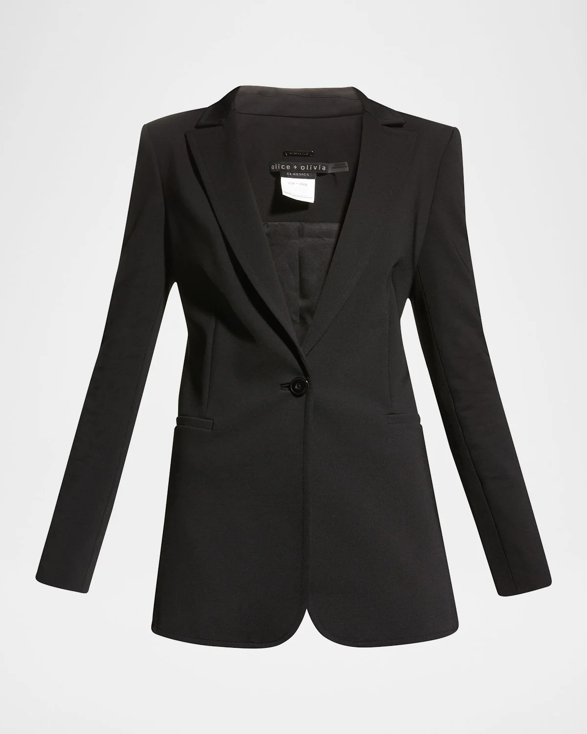Alice + Olivia "Breann" signature long fitted blazer Approx. 28"L from shoulder to hem Notched lapels; singlebutton front Long sleeves; button cuffs Side welt pockets Slimcut fit Hem falls below the hip Viscose/nylon/elastane Lining: Polyester Dry clean Imported