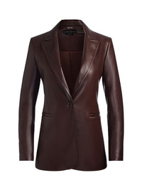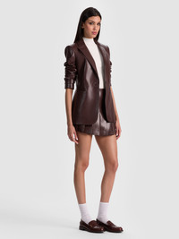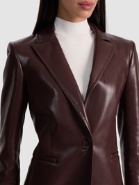 The ultimate power piece, softened in a moody floral. Breann is one of our signature blazer silhouettes-strong shoulder, slim through the body, and finished with a sleek back vent. This version gets an edgy twist in vegan leather that's perfect for a night out with the girls. Wear it with its matching Olivia Vegan pant, pair it with a mini skirt, or make this brown faux leather blazer the unexpected star of your going-out look. DETAILS - Fitted blazer - Vegan leather - Strong shoulders - Front button closure - Back vent - 100% polyurethane - Dry clean only - Imported FIT - Model is 5'10" and wearing a size 0 - Length from the shoulder: 27 1/4" - Fits true to size, take your normal size