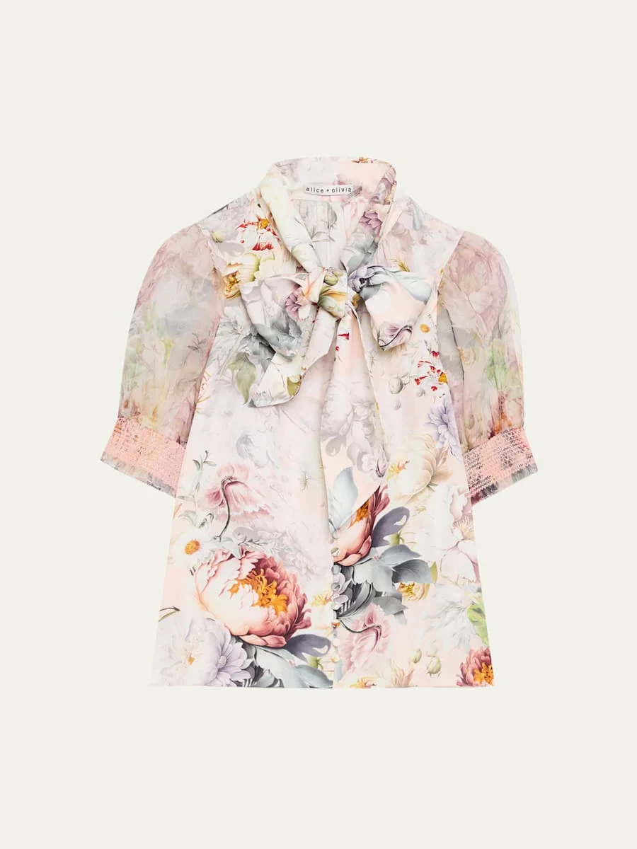 Framed with semisheer puff sleeves, ALICE + OLIVIA's "Brentley" silkblend blouse features a bold floral print Approx. 23"L from shoulder to hem Selftie neckline Short sleeves; smocked cuffs Relaxed fit Hip length Button front closure Viscose/silk/polyester Lining: Recycled polyester Dry clean Imported SIZE amp; FITModel measurements: 5'10" tall Model is wearing a US size 4/Small