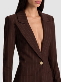 We created the perfect brown pinstripe blazer. Cut from pinstriped twill, it’s tailored through the waist with structured shoulders and finished with rolled cuffs for a slightly undone feel. A single button closure adds polish. Ideal for elevating denim or anchoring a full suiting look. DETAILS - Fitted blazer - Pinstriped twill - Rolled cuffs - Single button closure - Shoulder pads - Front pockets - 33% viscose, 33% polyester, 31% recycled polyester, 3% elastane - Dry clean only - Imported FIT - Model is 5'10" and wearing a size 2 - Length from the shoulder: 29 1/2" - Fits true to size, take your normal size