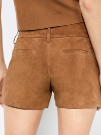 Tailored from supple lambskin suede, these suede shorts elevate any look. They have a mid-rise, sitting on your natural waist, and slim legs. A hook-and-eye closure ensures a seamless fit while two front slash pockets and back welt pockets offer everyday wearability. Effortless chic and ultra-versatile, they are a wardrobe essential. DETAILS - Suede with 3m waterproof finish - Low rise - Hidden front hook and zipper closure - Front slash pockets - Back welt pockets - Belt loops - 100% lamb leather - Dry clean only - Imported FIT - Model is 5'10" and wearing a size 0 - Front rise: 9 1/4" - Inseam: 3 1/2" - Fits true to size, take your normal size