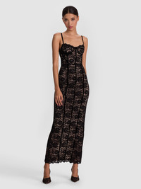 Introducing After Five, our new cocktail dressing collection--because it's 5 o'clock somewhere. The Carissa is a masterclass in slaying. Crafted from stretch lace with nude lining, it hugs the body while leaving just enough to the imagination. Its bustier bodice and soft underwire cups lift and shape, while adjustable straps ensure a flawless fit. From its delicate floral detailing to its dramatic maxi length, it's designed to make an entrance and leave a lasting impression. Trust us, this is your go-to showstopper. Romantic, sculptural, and unmistakably sexy. DETAILS - Maxi dress - Lined rosebud corded stretch lace - Bodycon fit - Bustier bodice - Adjustable straps - Back vent - Back zipper closure - 90% polyester, 10% elastane - Dry clean only - Imported FIT - Model is 5'10" and wearing a size 0 - Length from the shoulder: 60" - Fits true to size, take your normal size