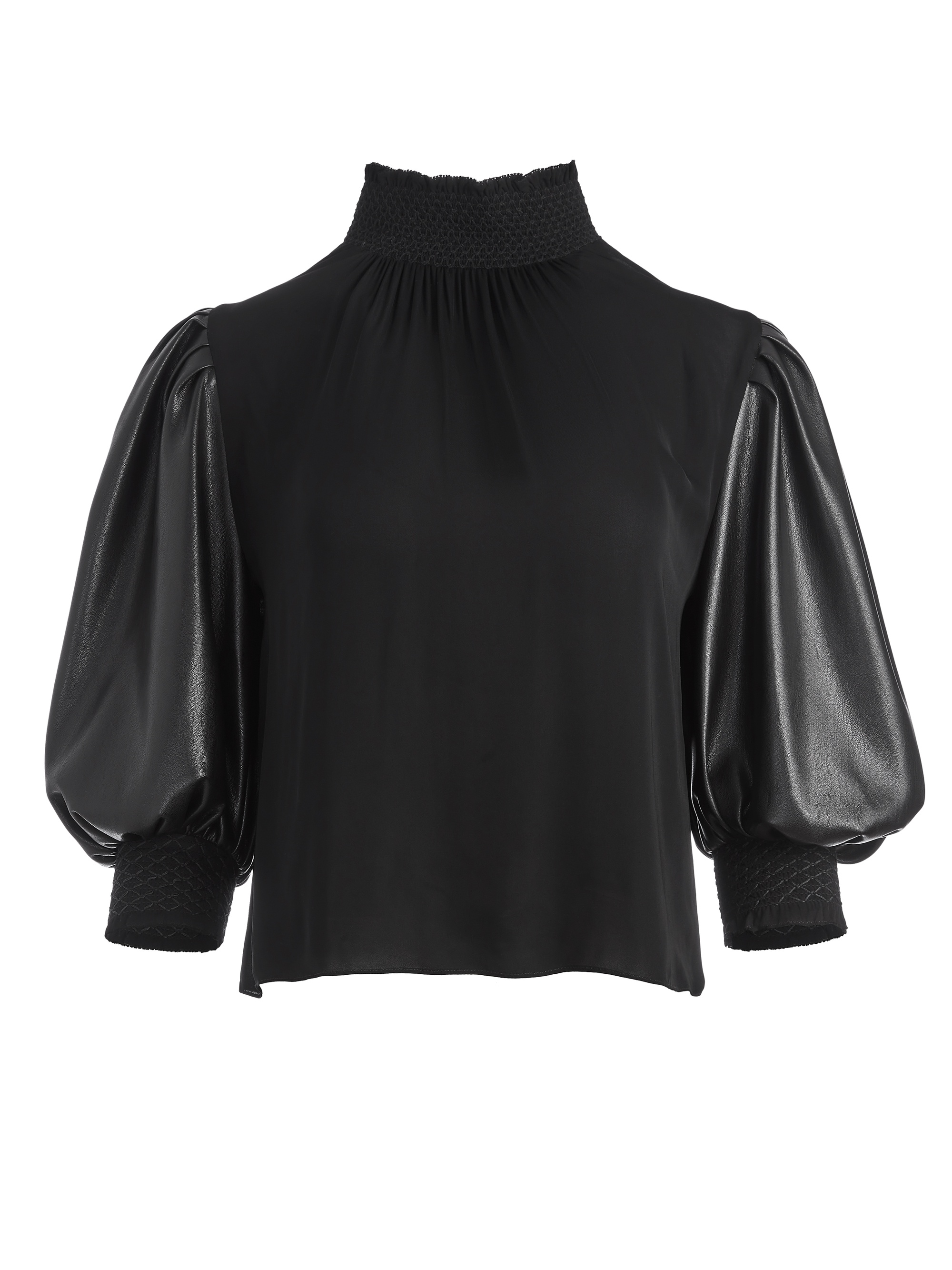 A top with vegan leather statement sleeves. This is the shirt that takes things up a notch (or 12). PRODUCT DETAILS - Mock neck - 3/4 Length sleeves - Smocked neck and sleeve cuffs - Button closure at back neck - Vegan leather sleeves - Total length: 22 1/2” - Body: 100% viscose - Sleeves: 100% polyurethane (vegan leather) - Lenny is wearing a size Small and her measurements are 5’11”, 31” bust, 24” waist, 35.5” hips - Runs small, we recommend sizing up one size. - Dry clean only - Imported