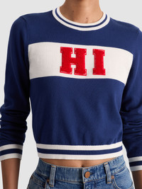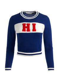 Say hi - literally - to your new favorite sweater. This version of our Carolann pullover features a cheeky embroidered greeting on the front-proof that your outfit can start the conversation for you. The cropped silhouette, striped tipping, and soft cotton knit keep things equal parts playful and wearable. Style it with denim or a mini for a wink of charm. DETAILS - Knit sweater - Shrunken fit - Embroidered patchwork - Crew neck - Striped tipping - 97% cotton, 3% elastane - Dry clean only - Imported FIT - Model is 5'10" and wearing a size XS - Length from the shoulder: 18 1/2" - Fits true to size, take your normal size