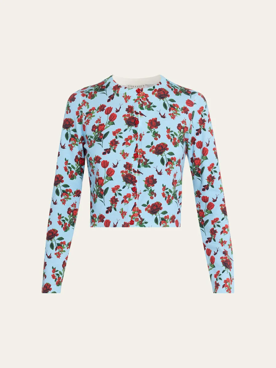 Finished with roseshaped buttons, the "Carson" cardigan by ALICE + OLIVIA features a bold, allover floral print Approx. 18.5"L from shoulder to hem Crew neckline Long sleeves; approx. 31.5"L Slim fit Cropped hem Button front closure Cotton/elastane Dry clean Imported SIZE amp; FITModel measurements: 5'10" tall Model is wearing a US size 4/Small