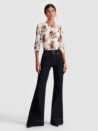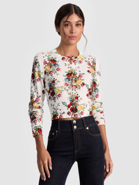 A little cardigan with a lot of personality. Carson is cropped, close-fitting, and adorned in colorful florals that feel straight out of a vintage flea market. The 100% cotton construction is soft to the touch and hugs the body just right, while the shrunken silhouette keeps things fitted and flirty. Preppy, playful, and unexpectedly cool. DETAILS - Floral cardigan - Printed cotton - Shrunken fit - Cropped - Button front closures - 100% cotton - Dry clean only - Imported FIT - Model is 5'10" and wearing a size XS - Length from the shoulder: 19" - Fits true to size, take your normal size