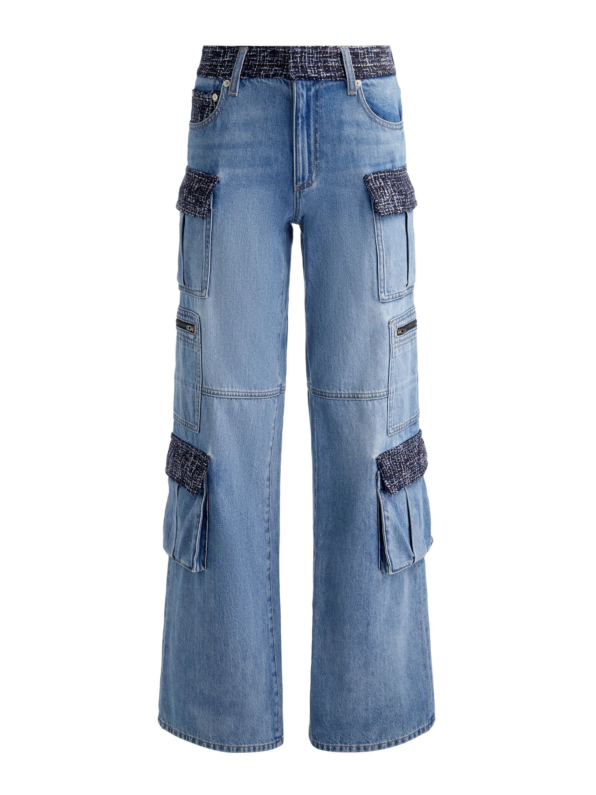 Borrowed from the boys, worn your way. The Cay Jean channels laidback chic with its slouchy fit, low rise, mixed-media panels, and utilitarian pockets. In a classic vintage wash, it’s perfect with a tucked tee or feminine blouse for major off-duty energy. DETAILS - Cargo jean - Baggy fit - Low rise - Tweed mixed media detailing - Belt loops - Hidden front hook and zipper closure - 100% cotton - Turn inside out and machine wash on cold with like colors - Imported FIT - Model is 5'10" and wearing a size 25 - Front rise: 10" - Inseam: 34 1/2" - Fits true to size, take your normal size