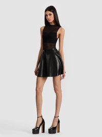 A classic A+O silhouette, reimagined. The Chara dress features a sculpted mesh bodice with a sweetheart lining and a flared vegan leather skirt that brings just the right amount of edge. The drop waist gives it that flirty, ballet-inspired shape-equal parts polished and playful. DETAILS - Mini dress - Mesh bodice with bandeau lining - Vegan leather skirt - Fit and flare - Back zipper closure - Bodice: 90% polyester, 10% elastane - Skirt: 100% polyurethane - Dry clean only - Imported FIT - Model is 5'10" and wearing a size 0 - Length from the shoulder: 33" - Fits true to size, take your normal size