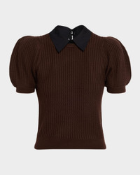 Crafted from a soft cableknit wool blend, the "Chase" sweater by Alice + Olivia boasts a contrast point collar for a refined, preppy silhouette. Short puff sleeves; approx. 18.5"L Classic fit Hem sits at the hip Back hook and zip closure Wool/elastane Unlined Dry clean Imported