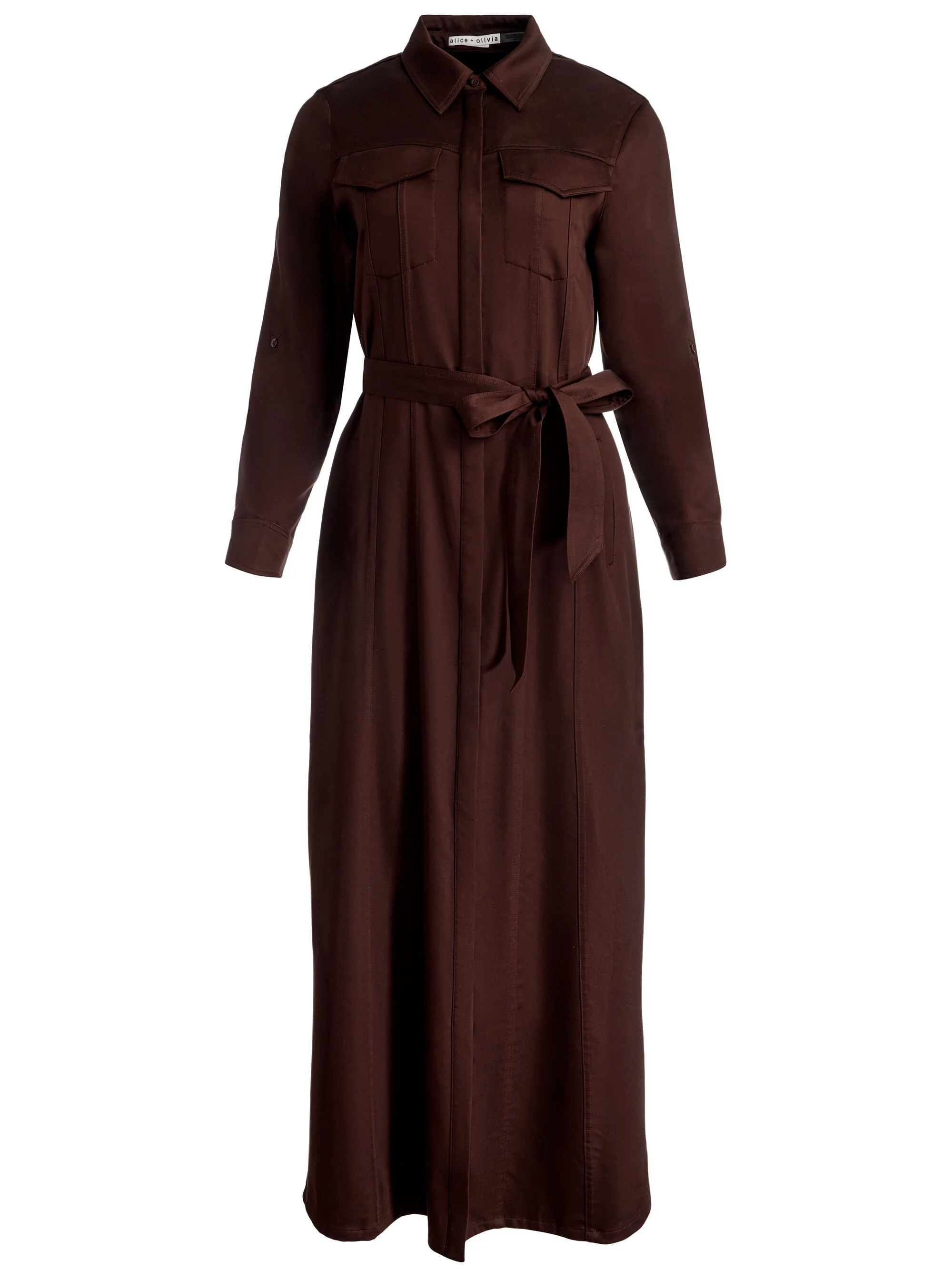 The Chassidy is a fresh take on shirt dressing with a fluid silhouette and a refined, elongated shape. It has a classic button-up front, a structured collar, and a detachable waist tie. The soft lyocell drapes beautifully, providing breathability and movement, while subtle design details like the balloon sleeves add a feminine touch. A wardrobe staple with a timeless appeal, this dress can be dressed up or down for any occasion. DETAILS - Maxi shirt dress - Stretch Tencel twill - Blouson sleeves - Adjustable tie waist - Side slit - Front button closure - 59% lyocell, 35% polyester, 6% elastane - Dry clean only - Imported FIT - Model is 5'10" and wearing a size 0 - Length from the shoulder: 55" - Fits true to size, take your normal size