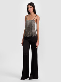 Chi is pure movement--beaded crystal fringe that glimmers with each step and effortlessly commands attention. The mesh-lined silhouette stays sleek and comfortable while the embellishment delivers high-impact sparkle. It’s the top you reach for when the dress code calls for holiday glam. Just add tailored trousers or denim, and you’re instantly dance-floor ready in this dazzling fringe tank top. DETAILS - Embellished tank top - Beaded crystal fringe - Mesh lining - Back zipper closure - 91% nylon, 9% elastane - Dry clean only - Imported FIT - Model is 5'10" and wearing a size XS - Length from the shoulder: 23" - Fits true to size, take your normal size