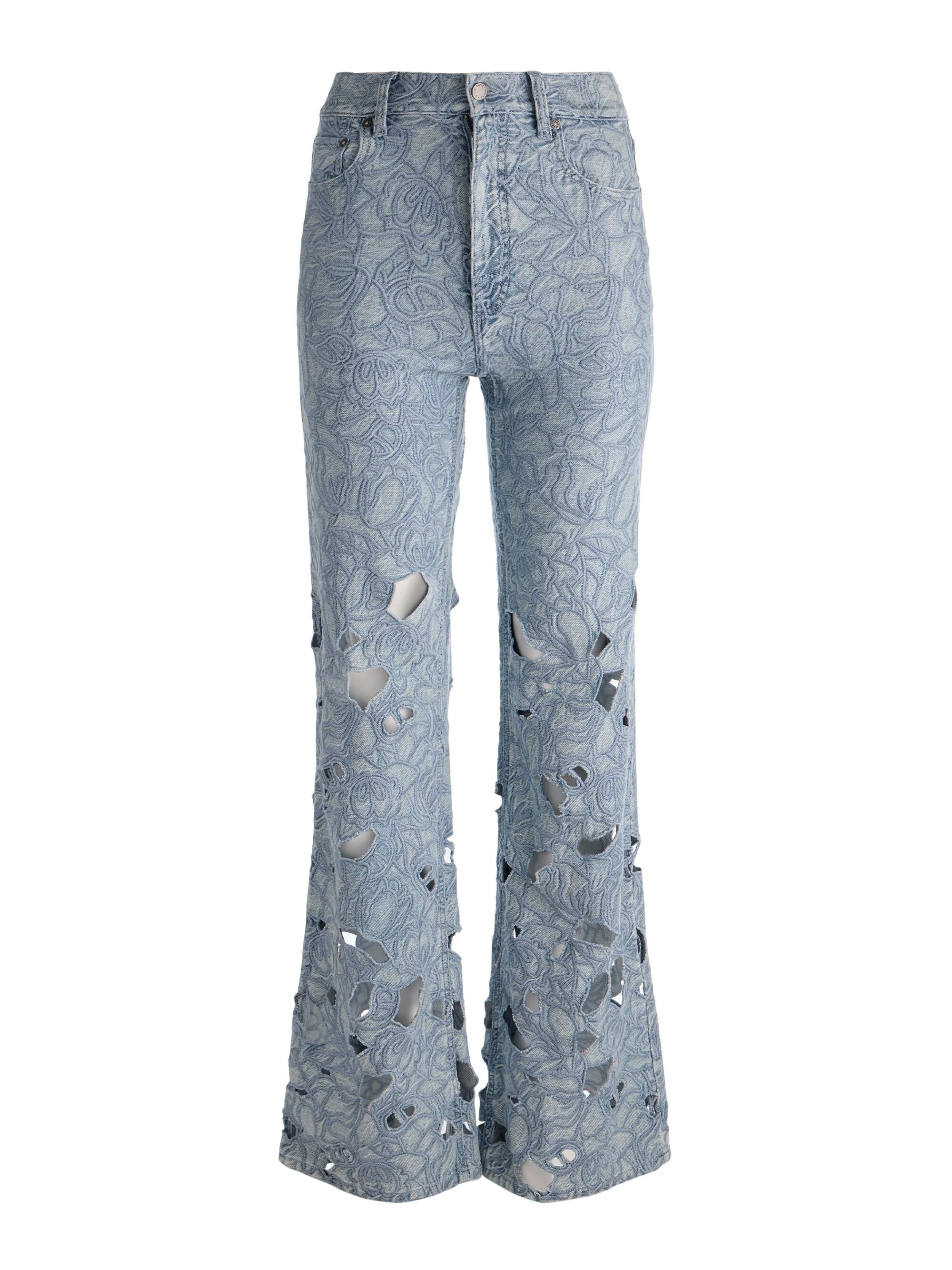 A wide-leg denim hero. The Chic embroidered jeans have a high-rise, relaxed fit, and are finished in lasercut denim that adds dimension without feeling heavy. They’re comfortable, sculpting, and endlessly easy to style. Pair them with the coordinated Finely top or Chloe jacket--this denim story is fully mix-and-matchable. DETAILS - Wide leg jean - Lasercut denim - High rise - Relaxed fit - Belt loops - Front button and zipper closure - 100% cotton - Dry clean only - Imported FIT - Model is 5'10" and wearing a size 24 - Front rise: 10 1/2" - Inseam: 34 1/2" - Fits true to size, take your normal size