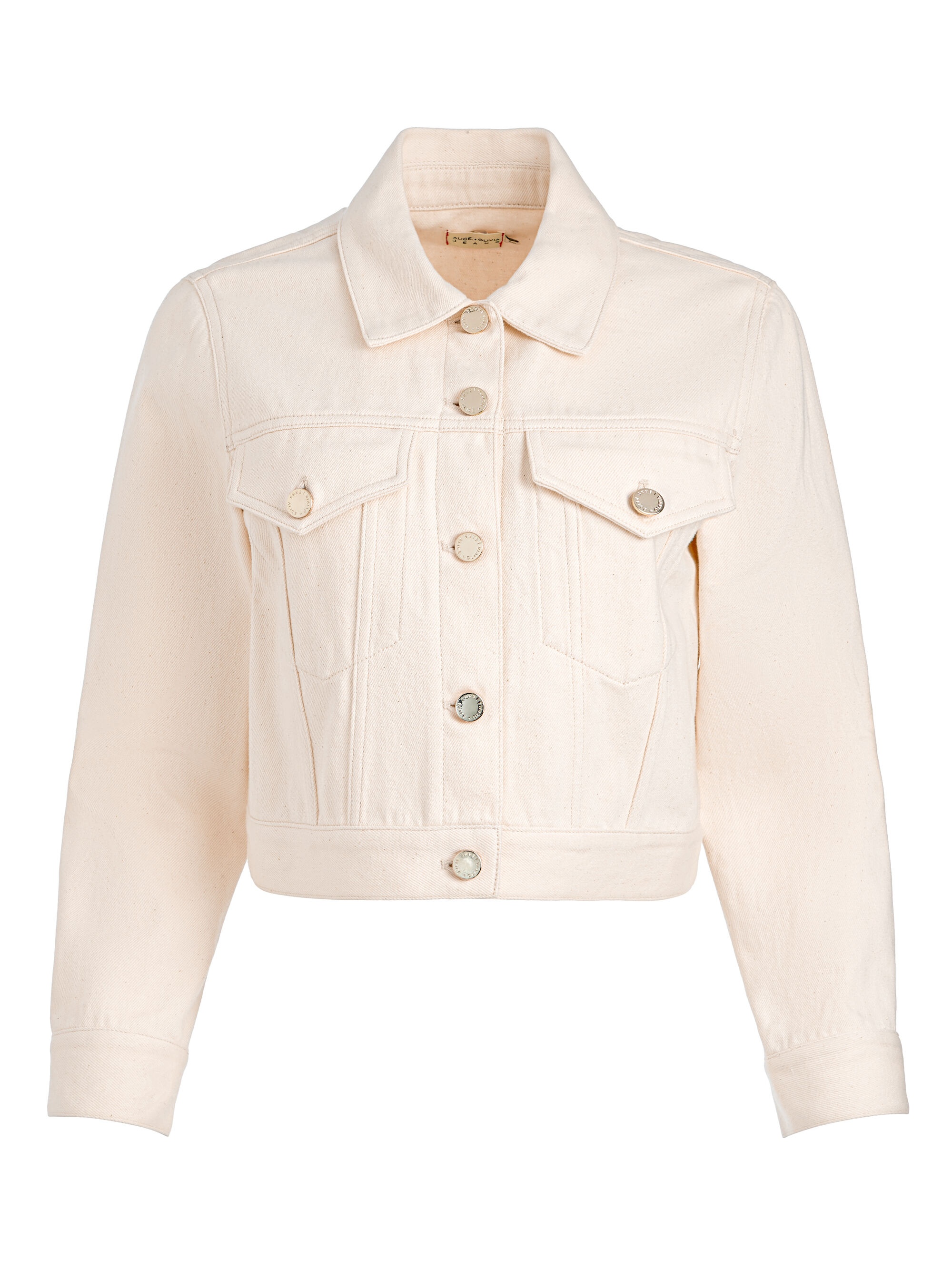 In a gorgeous and versatile oatmeal shade, this fun spin on the classic denim jacket will make a statement everywhere it goes. It's made from premium denim and tailored for a slightly cropped, boxy fit. Silver buttons, two patch pockets and a collared placket give it structure. Lean into its elevated staple vibe and pair with its matching Amazing jeans. You’ll look like you just stepped off a runway. DETAILS - Denim jacket - Cropped - Boxy fit - 100% cotton - Dry clean only - Imported FIT - Model is 5'10" and wearing a size 0 - Length from the shoulder: 18" - Fits true to size, take your normal size