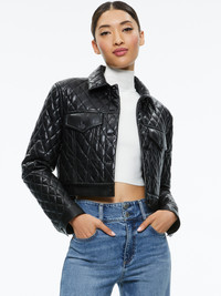 Vegan leather like you’ve (probably) never seen it. This features quilted vegan leather for a bit of texture. Plus, a cropped, boxy fit, collar, button front and buttons at the cuffs. PRODUCT DETAILS - Cropped jacket - Quilted vegan leather - Boxy fit - Front button closure - Collared - Face: 100% polyurethane - Back: 100% polyester - Dry clean only - Imported