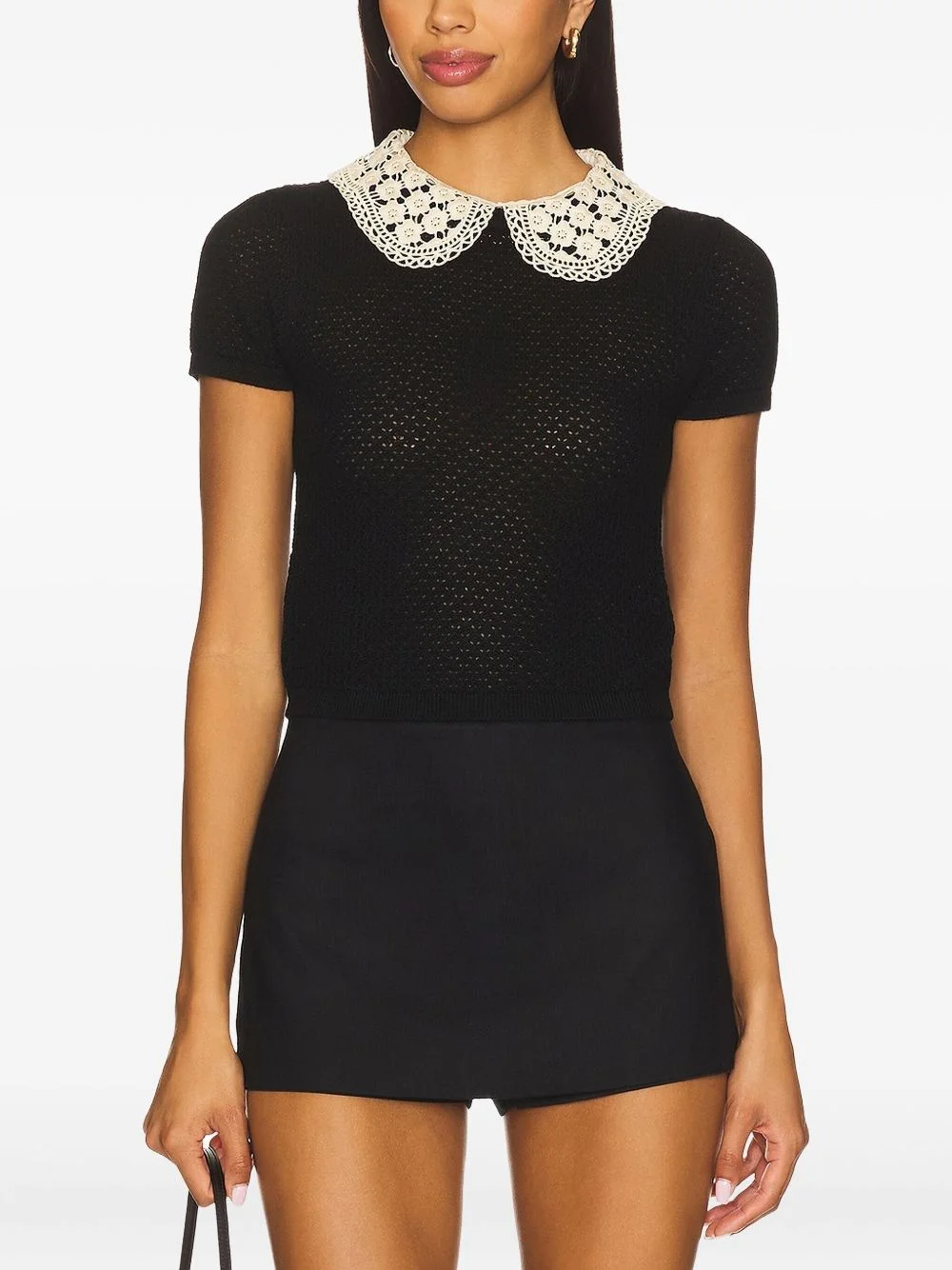 crochet-collar short-sleeve top Highlights - Black - Crochet collar - Short sleeves - Open knit - Round neck Imported Composition Wool 99%, Nylon 1% Washing instructions Read Manufacturer Guidelines