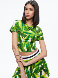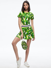 A crewneck t-shirt perfect for your activities on and off the court (especially pickleball) on the season's hottest days. This features a moisture-wicker feeling fabric and our favorite summer prints. DETAILS - Crewneck - Short sleeve - Slightly cropped - Total length: 20” - Jersey fabric - 95% viscose, 4% elastane - Fits true to size, take your normal size - Model is wearing a size Small and her measurements are 5’10”, 32” bust, 23” waist, 34” hips - Dry clean only - Imported