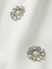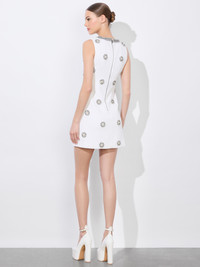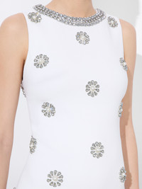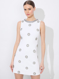 Catch the light at every angle with our Clyde Dress. It is cut from a recycled stretch satin crepe into a modish shift shape that is illuminated with jeweled embroidery. Precious pearls and twinkling crystal embellishments are artfully placed to look like flowers. Complement its crystal-encrusted collar with some sparkling earrings. DETAILS - Shift fit - Hand embellished crystal neckline - Floral motif appliques - Back zipper closure - Lined - Recycled stretch satin crepe - 62% recycled polyester, 36% polyester, 2% elastane - Dry clean only - Imported FIT - Model is 5"10" and wearing a size 0 - Length from the shoulder: 33 1/2" - Fits true to size, take your normal size