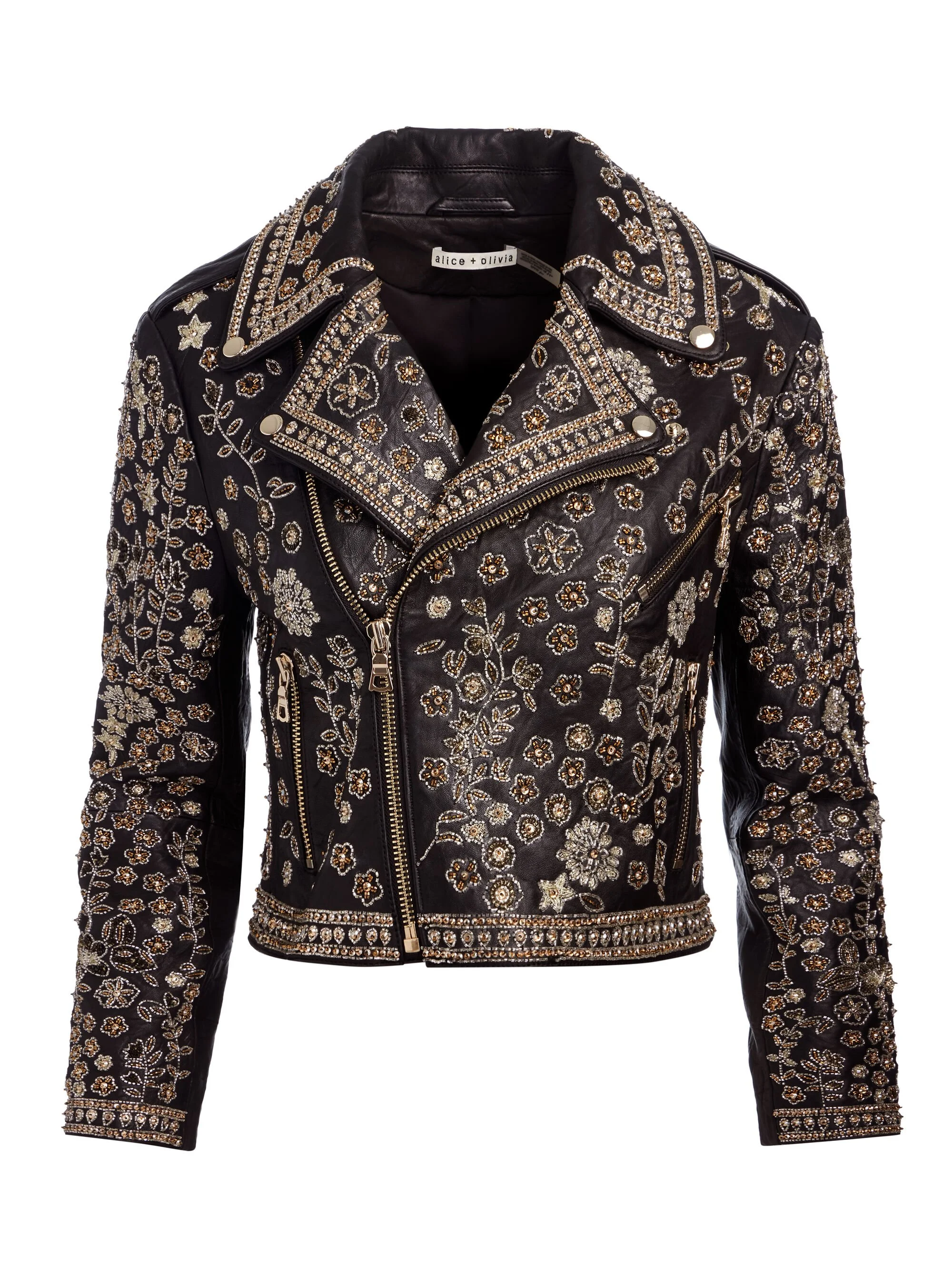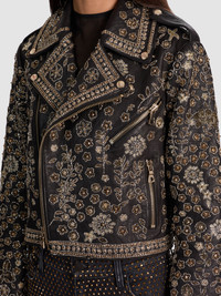 A great black moto jacket is a closet staple and this one, adorned with custom crystal embellishments, makes it anything but boring. Made from 100% lamb leather, Cody is a true investment piece that will stand the test of time. DETAILS - Embellished leather jacket - Cropped - Long sleeve - Side pockets - Front zipper closure - 100% lamb leather - Dry clean only - Imported FIT - Model is 5'10" and wearing a size XS - Length from the shoulder: 19" - Fits true to size, take your normal size