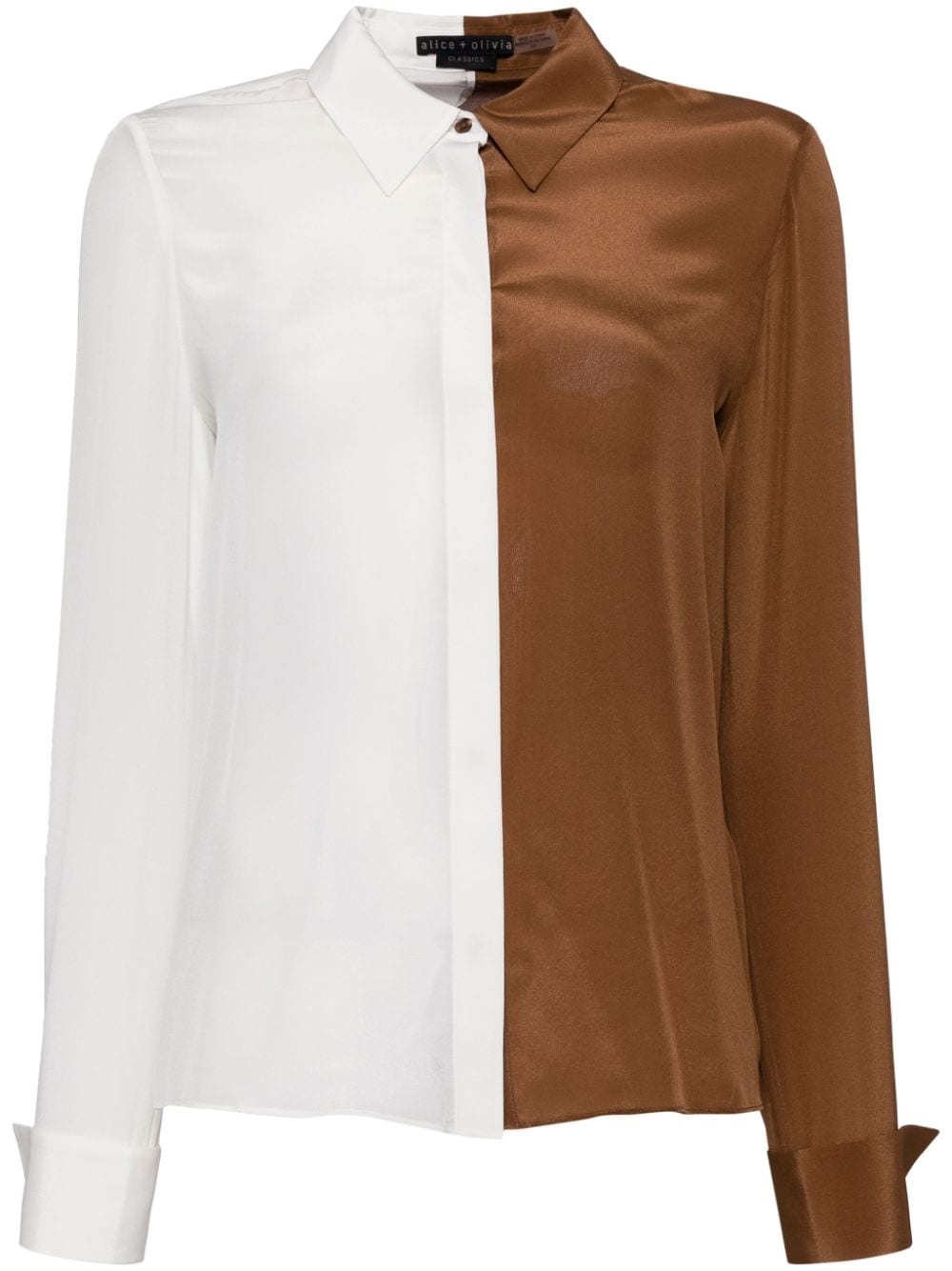 Willa color block shirt Highlights - White/brown - Silk - Satin weave - Concealed front button fastening - Long sleeves - Turn-up cuffs - Curved hem Imported Composition Silk 100% SIZE & FIT Model measurements Height 5 ft 10 in(1.77 m) Bust/Chest 28.74 in(73 cm) Hips 33.85 in(86 cm) Waist 23.22 in(59 cm) FittingInformation Designed for a slim fit that sits just away from the body offering a close yet comfortable fit Made from a lightweight non-stretch fabric