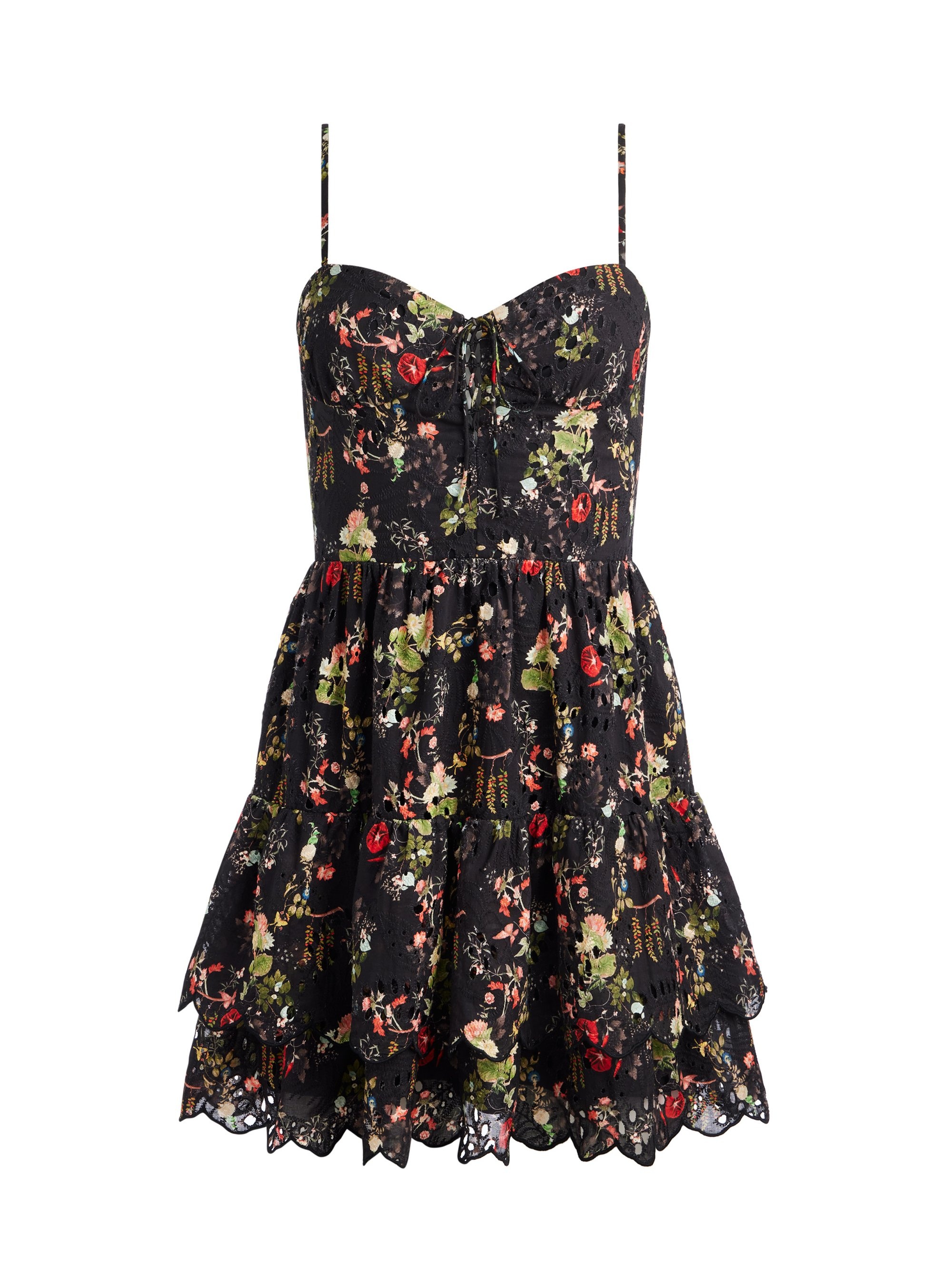 This flirty minidress is a one-and-done summer uniform with a tie front, printed cotton, tiers of ruffles and an exposed back zip closure. We think it looks just as great with sneakers as it does with ballet flats. DETAILS - Mini dress - Sleeveless - Tie front - Printed - Tiered ruffles - Exposed zipper back closure - 100% cotton - Dry clean only - Imported FIT - Model is wearing a size 2 and her measurements are 5’10”, 32” bust, 23” waist, 34” hips - Length from the shoulder: 33 1/2" - Fits true to size, take your normal size