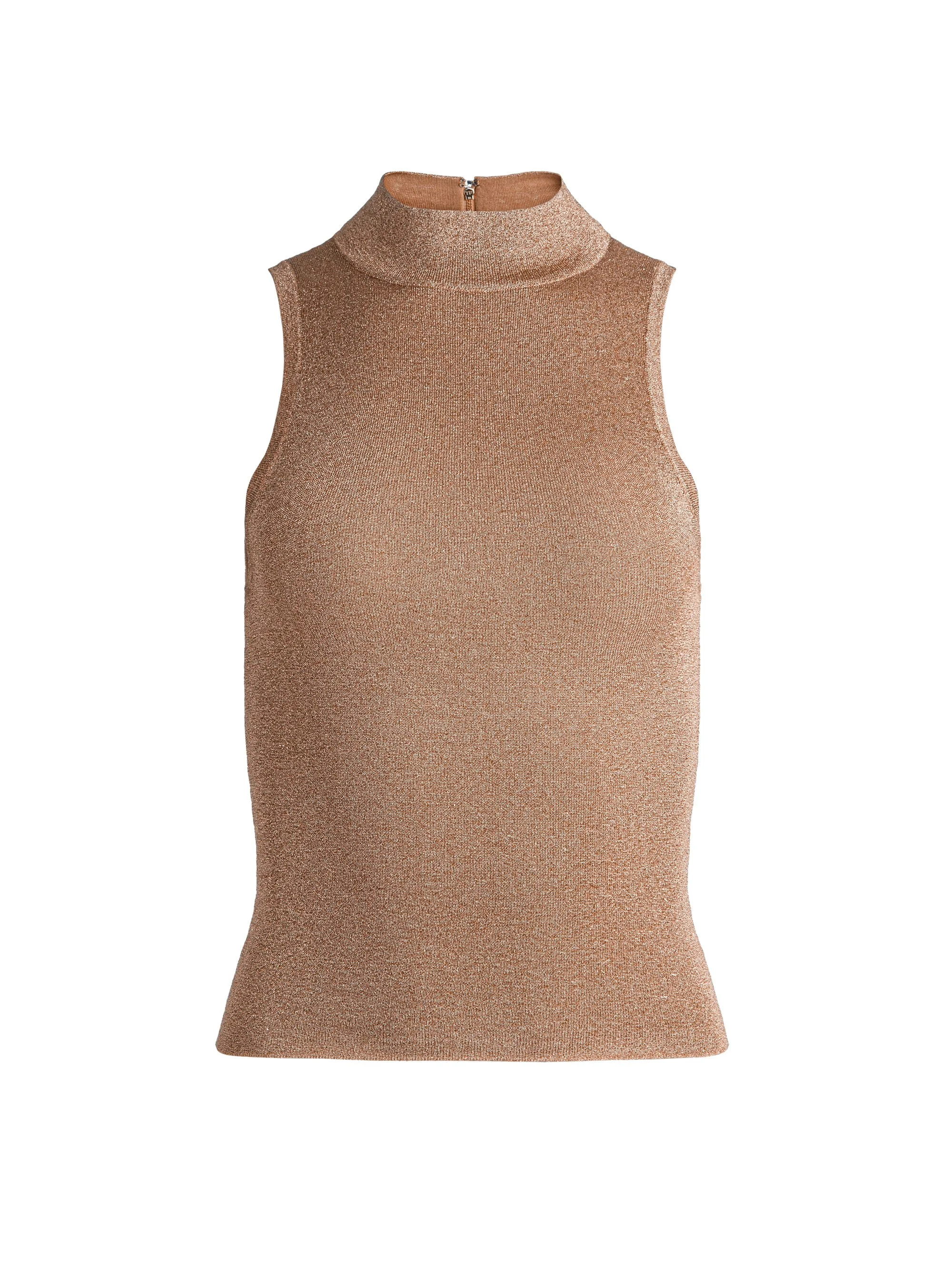 A knit ribbed tank (with a crazy-flattering fit) is a wardrobe staple and this one fits the bill perfectly. It's constructed from a luxe wool blend and includes a turtleneck perfect for fall weather, while the metallic stitching makes it the ideal piece for transitioning into a night out. DETAILS - Wool tank - Metallic knit - Fitted - Turtleneck - Sleeveless - 56% wool, 38% polyester, 6% elastane - Dry clean only - Imported FIT - Model is 5'10" and wearing a size XS - Length from the shoulder: 21 1/2" - Fits true to size, take your normal size