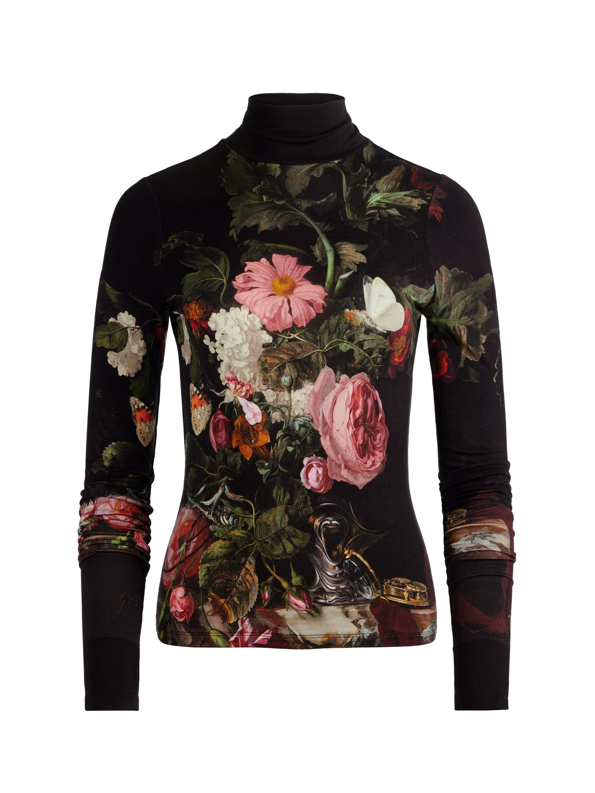 A statement piece that’s both bold and polished. The Delaina turtleneck crop top features our novel floral print in an ultra-soft viscose body. Wear it with high-waisted trousers and boots for a chic everyday look. DETAILS - Crop top - Printed soft jersey - Fitted - Long sleeve with thumbholes - Turtleneck - 97% viscose, 3% elastane - Dry clean only - Imported FIT - Model is 5'10" and wearing a size XS - Length from the shoulder: 19" - Fits true to size, take your normal size