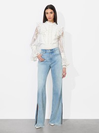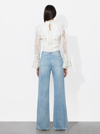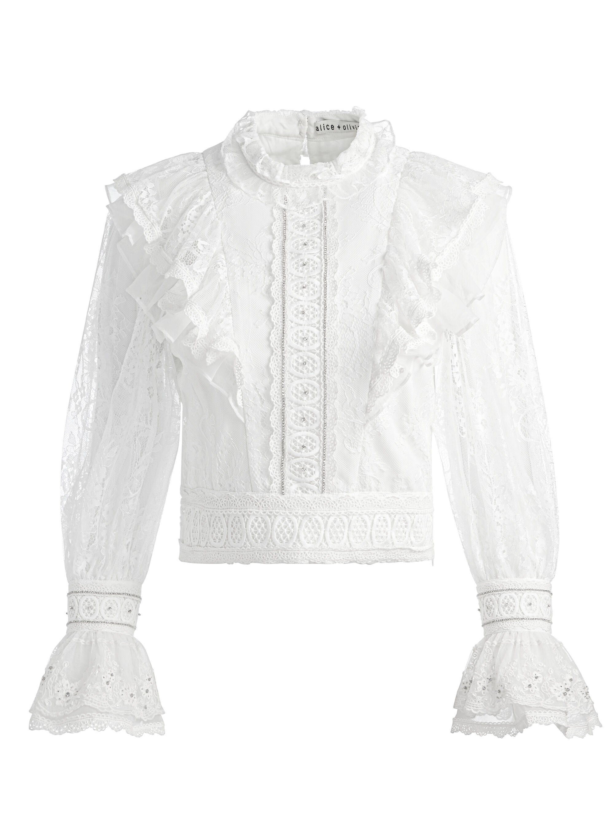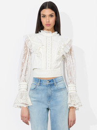 Romantic and statement-making, this cropped lace blouse blends bohemian elegance with modern femininity. Featuring intricate ruffled lace detailing along the bodice and shoulders, the semi-sheer fabric adds a delicate touch. A lined bodice allows for easy wear. The blouson sleeves, finished with dramatic ruffled cuffs, enhance the ethereal aesthetic. A fitted waist and high neckline create a structured contrast to the airy, textured lace, making this blouse a standout piece for elevated styling. DETAILS - Cropped blouse - Ruffled lace - Blouson sleeves - Embellished pearl buttons - Back keyhole - Side zipper closure - Lined - 100% nylon - Dry clean only - Imported FIT - Model is 5'10" and wearing a size XS - Length from the shoulder: 18" - Fits true to size, take your normal size