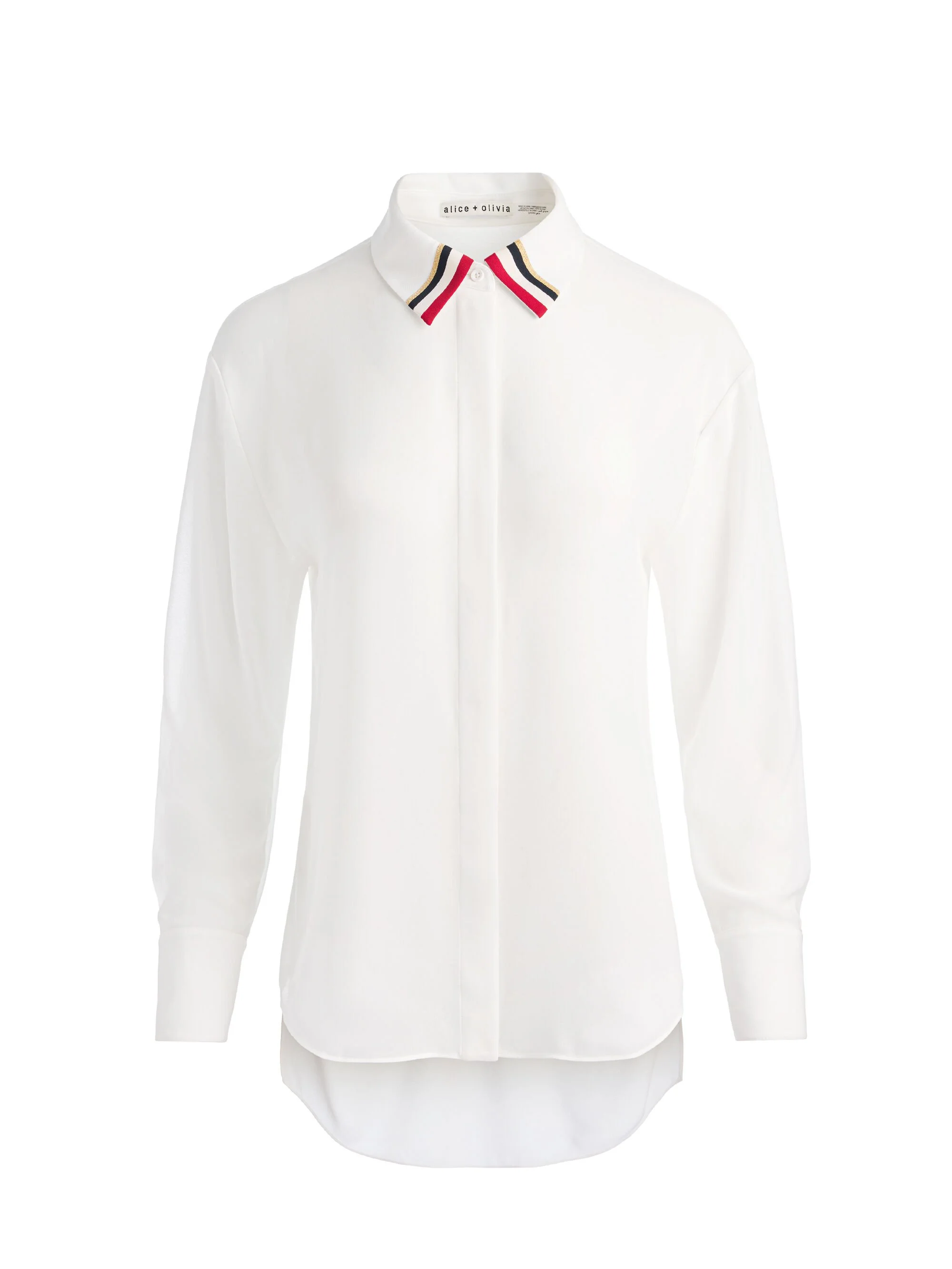 Effortlessly chic, our Dimitra button down brings a modern twist to a timeless classic. The relaxed fit and high-low hemline drapes beautifully, while the crisp collar and striped trim add a polished finish. Crafted from a lightweight, silky georgette, it feels as good as it looks--soft, breathable, and perfect for layering. Whether styled tucked into tailored trousers or left loose over denim, this versatile piece transitions seamlessly from work to weekend. Bold yet refined, it's a staple you'll reach for again and again. DETAILS - Button down shirt - Flat georgette - Striped grosgrain trim with metallic yarn - Hidden placket - 100% polyester - Dry clean only - Imported FIT - Model is 5'10" and wearing a size XS - Length from the shoulder: 27" - Runs large, size down for a slimmer fit