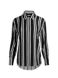 Effortlessly chic, our Dimitra black and white striped shirt brings a modern twist to a timeless classic. The relaxed fit and high-low hemline drapes beautifully, while the crisp collar and buttoned cuffs add a polished finish. Crafted from a lightweight, silky fabric, it feels as good as it looks- soft, breathable, and perfect for layering. Whether styled tucked into tailored trousers or left loose over denim, this versatile piece transitions seamlessly from work to weekend. Bold yet refined, it’s a staple you’ll reach for again and again. DETAILS - Button down - Vertical black and white stripes - Oversized fit - Hidden placket - High low hem - 100% viscose - Dry clean only - Imported FIT - Model is 5'10" and wearing a size XS - Length from the shoulder: 27" - Meant to be worn oversized, size down for a slimmer fit