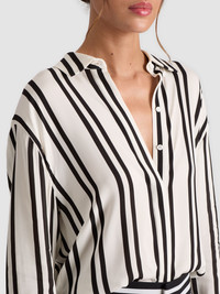 Effortlessly chic, our Dimitra black and white striped shirt brings a modern twist to a timeless classic. The relaxed fit and high-low hemline drapes beautifully, while the crisp collar and buttoned cuffs add a polished finish. Crafted from a lightweight, silky fabric, it feels as good as it looks- soft, breathable, and perfect for layering. Whether styled tucked into tailored trousers or left loose over denim, this versatile piece transitions seamlessly from work to weekend. Bold yet refined, it’s a staple you’ll reach for again and again. DETAILS - Button down - Vertical black and white stripes - Oversized fit - Hidden placket - High low hem - 100% viscose - Dry clean only - Imported FIT - Model is 5'10" and wearing a size XS - Length from the shoulder: 27" - Meant to be worn oversized, size down for a slimmer fit
