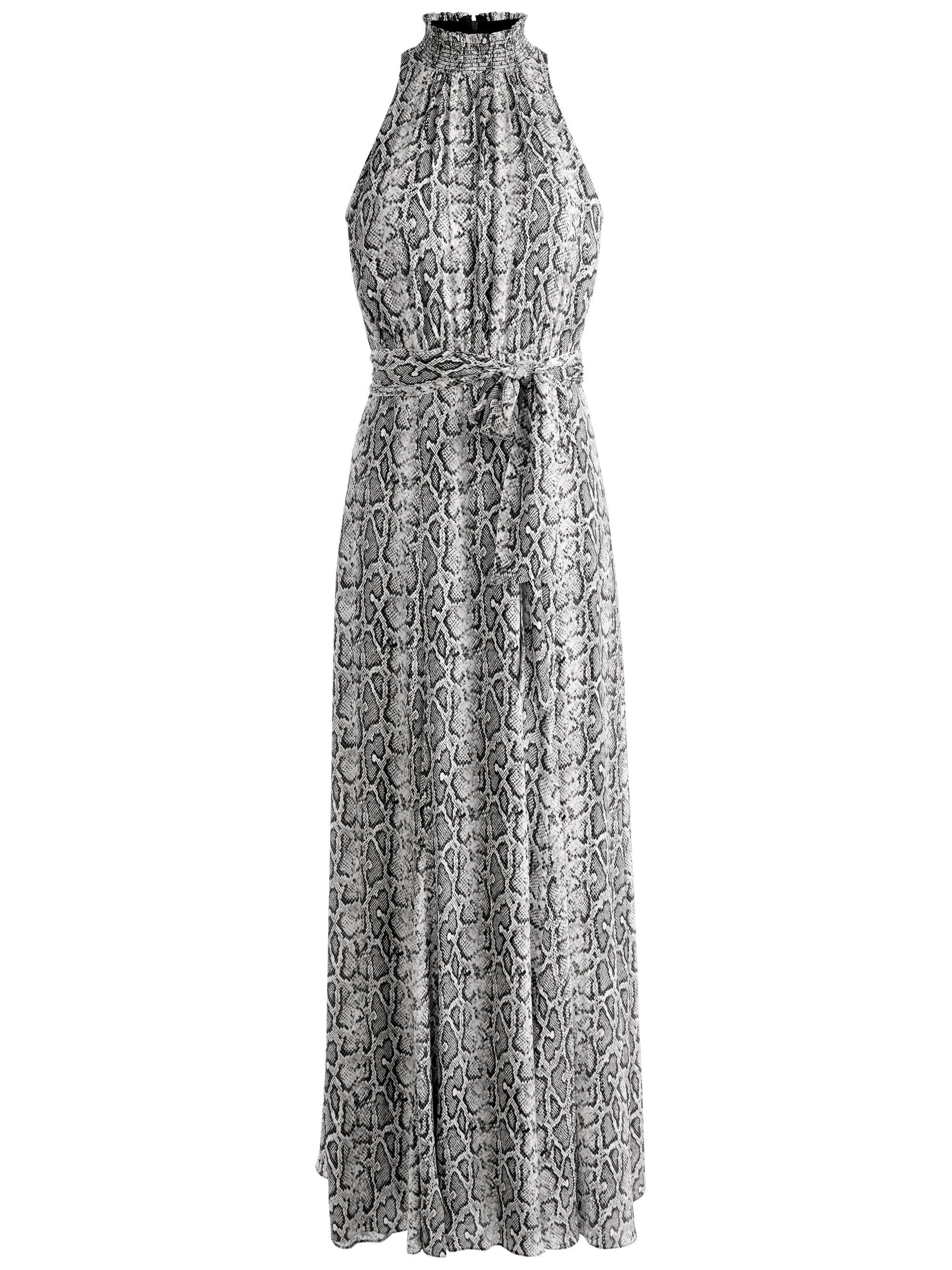 This romantic dress includes so many things to love, like that high neckline, gorgeous snakeskin print, adjustable tie belt and sleeveless construction. Plus we crafted it in a dreamy viscose that moves in a such a beautiful way. DETAILS - Maxi dress - Smocked high neck - Pleated godets - Zipper back closure - Sleeveless - 100% viscose - Dry clean only - Imported FIT - Model is wearing a size 2 and her measurements are 5’10”, 32” bust, 23” waist, 34” hips - Length from the shoulder: 59" - Fits true to size, take your normal size