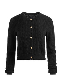 We created our perfect cable knit cardigan, in crazy soft cashmere that features just a hint of stretch for the most flattering fit and comfortable feel. A few details to note: the shrunken fit, button front, and perfect goes-with-everything shade of black. DETAILS - Cashmere cardigan - Cable knit - Cropped - Shrunken fit - Crew neck - Front button closure - 99% cashmere, 1% nylon - Dry clean only - Imported FIT - Model is 5'10" and wearing a size small - Length from the shoulder: 18 1/2" - Meant for a shrunken fit, size up for a less fitted look