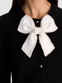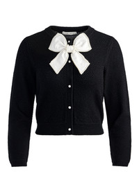 The cult-favorite cardigan gets a romantic new twist. This season’s Dollie is reimagined in ultra-soft merino wool with delicate pointelle stitching and a slightly shrunken, cropped silhouette. A removable oversized bow at the neck and pearl button closures add a touch of whimsy- and endless styling options. Sweet on its own or layered over your favorite dress, it’s a closet staple with personality. DETAILS - Wool cardigan - Cropped - Pointelle stitch - Detachable embellished bow - Pearl button closures - 99% merino wool, 1% nylon - Dry clean only - Imported FIT - Model is 5'10" and wearing a size XS - Length from the shoulder: 18 1/2" - Fits true to size, take your normal size