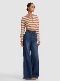 Meet your new favorite cardigan. Our beloved Dollie, spun from 100% cashmere, returns in cute stripes with an embroidered reminder stitched discreetly inside the neckline: “you are a star.” It’s our wink to the woman wearing it--because style should uplift you. The cropped fit makes it perfect for pairing with high-rise denim or feminine skirts, striking that line between preppy and playful. It’s the kind of piece that feels personal, polished, and a little bit magical every time you put it on. DETAILS - Cashmere striped cardigan - Embroidered text on inner back neck trim - Cropped - Shrunken fit - 100% cashmere - Dry clean only - Imported FIT - Model is 5'10" and wearing a size small - Length from the shoulder: 18 1/2" - Runs small, size up for a looser fit
