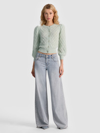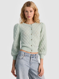 Delicate and feminine with just a hint of prep, Doris is the summer puff sleeve cardigan you didn’t know you needed. Designed in airy pointelle cashmere with pearl buttons, it layers beautifully over sundresses-or works solo when you’re feeling flirty. The shrunken fit adds a modern edge to an otherwise vintage-inspired silhouette. DETAILS - Cashmere cardigan - Pointelle stitch - Puffed sleeves - Pearl buttons - Shrunken fit - 99% cashmere, 1% nylon - Dry clean only - Imported FIT - Model is 5'10" and wearing a size XS - Length from the shoulder: 19" - Fits true to size, take your normal size