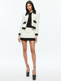 This collegiate tweed mini exudes just the right amount of "back to school" vibes, just add a cableknit sweater to complete the look. Note: The mid rise, back zip closure and graphic pattern. So chic. DETAILS - Mini skirt - Tweed - Mid rise - Back zipper closure - 60% polyester, 12% wool, 10% viscose, 9% acrylic, 5% cotton, 4% nylon - Dry clean only - Imported FIT - Model is wearing a size 2 and her measurements are 5’10”, 32” bust, 23” waist, 34” hips - Skirt length: 14 1/4" - Fits true to size, take your normal size