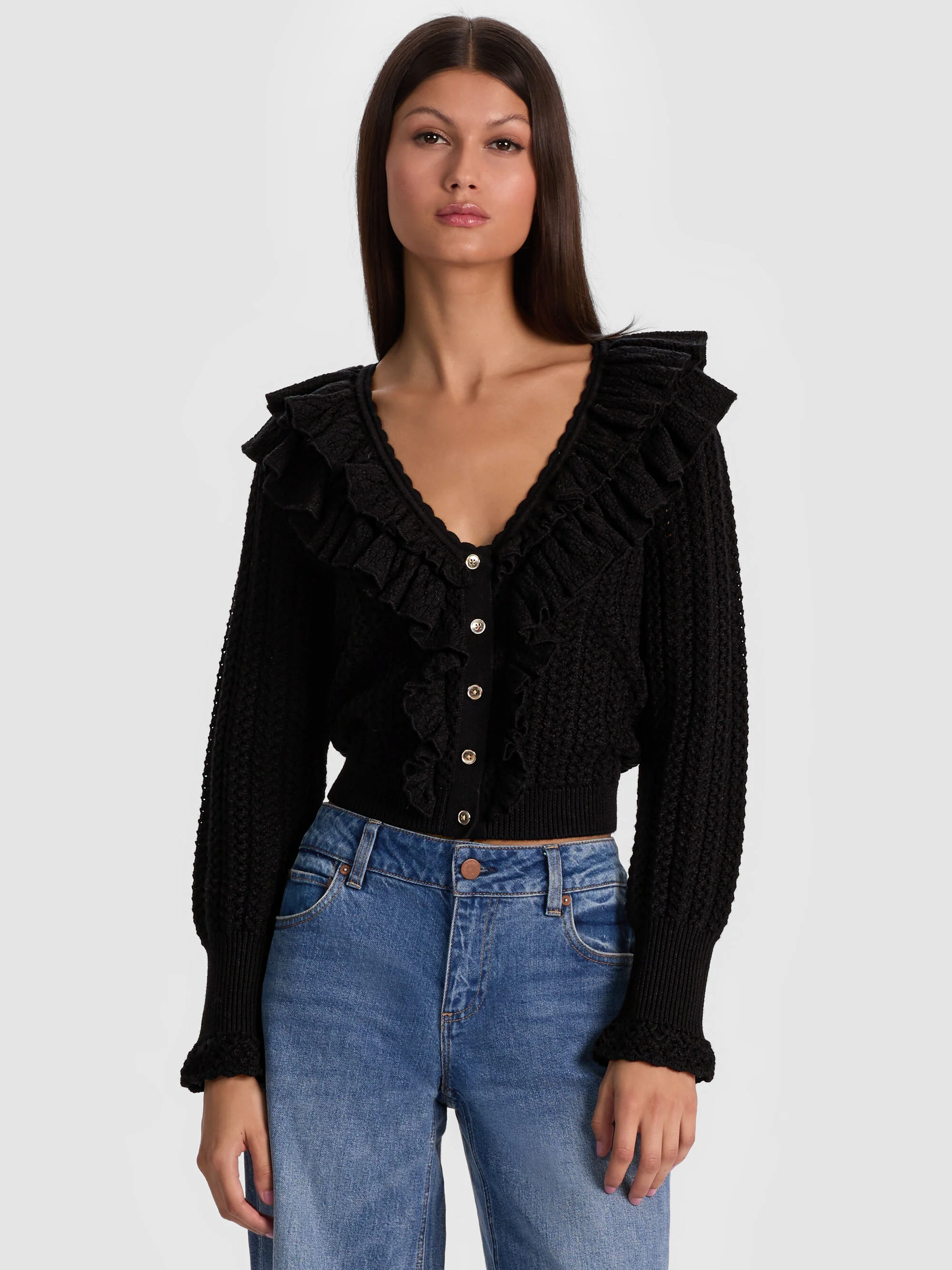 Soft meets statement. The Eileen is a cropped merino wool cardigan with a V neckline, blouson sleeves and layered ruffled trim that add feminine flair. Finished with front buttons, it works worn solo as a top or layered over camis and dresses. A cardigan that doesn’t just keep you cozy- it transforms your look. DETAILS - Wool cardigan - Pointelle stitch - Cropped - Ruffled neckline and placket - Gold button closures - 100% merino wool - Dry clean onlyImported FIT - Model is 5'10" and wearing a size XS - Length from the shoulder: 19 1/2" - Fits true to size, take your normal size