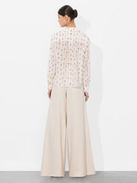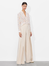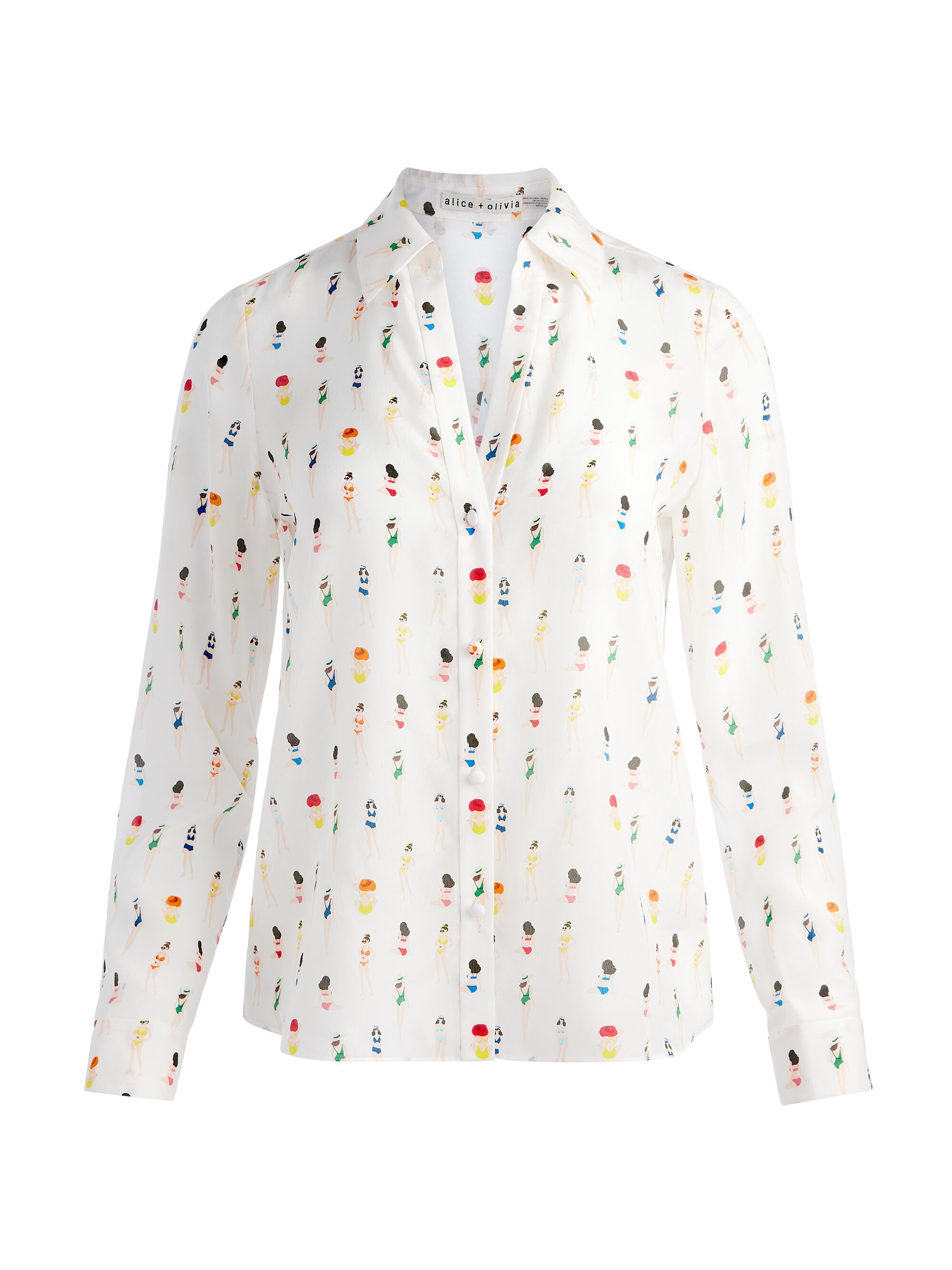 A whimsical twist on the everyday button down, this semi-sheer crepe de chine blouse features a cheeky print of bathing beauties -because sometimes you’re at your desk, but your mind’s on a beach. Tailored with a classic collar, button front, and subtle back pleating, it floats effortlessly on the body for a fit that’s polished yet relaxed. Live vicariously through the sunbathers on your shirt, and bring a little vacation to your 9-to-5. DETAILS - Button down - Printed silk crepe de chine - Slim fit - 100% silk - Dry clean only - Imported - a+o sustainability: made with natural material silk which is biodegradable FIT - Model is 5"10" and wearing a size Small - Length from the shoulder: 24" - Fits true to size, take your normal size