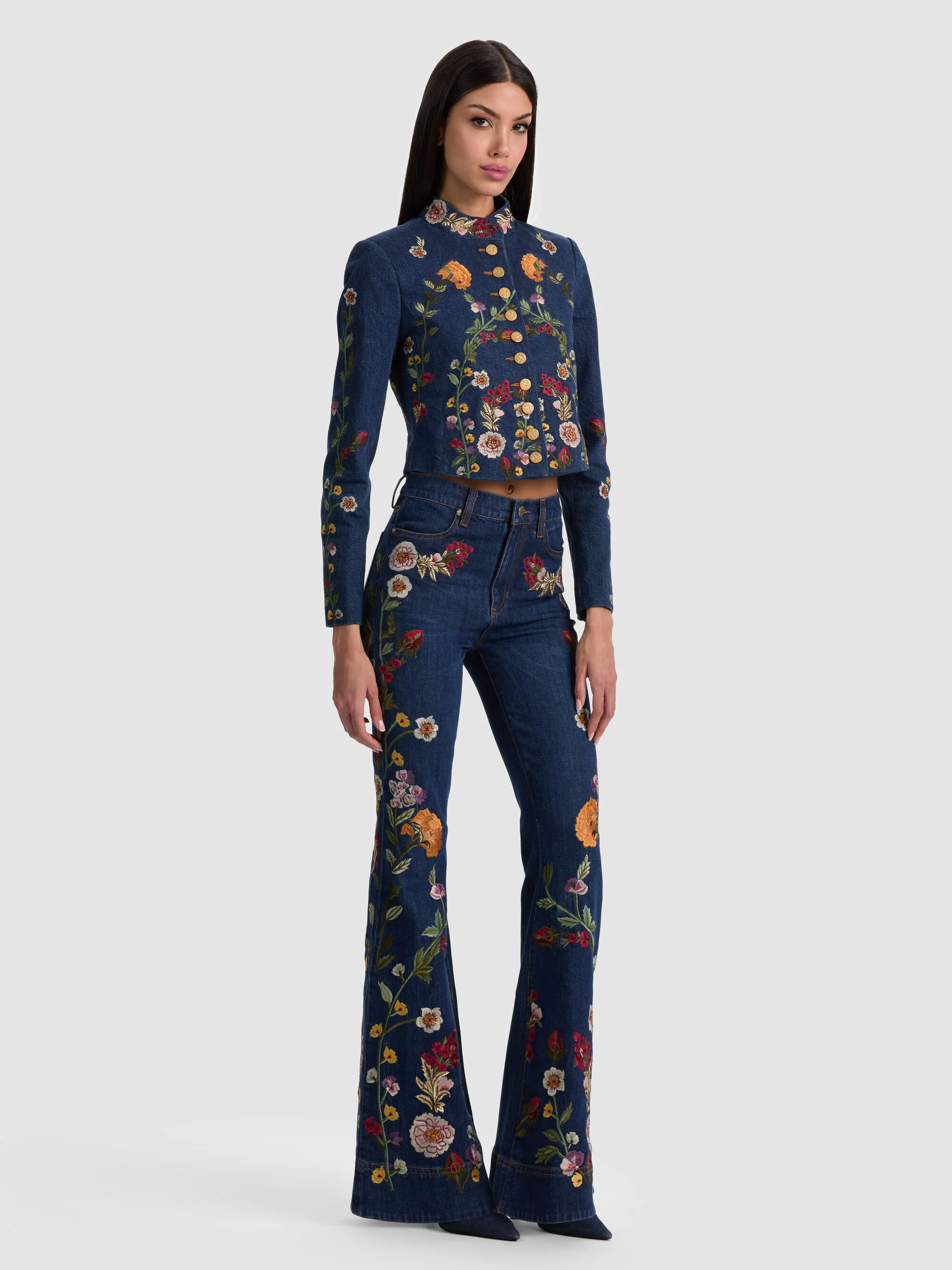 Inspired by classic utility styling, this cropped denim military jacket features intricate embroidery throughout and gold button closures for a refined finish. The structured shape balances perfectly with the shorter length, giving it a modern edge. Pair it with its matching jeans for a standout set, or layer it over eveningwear for a cool contrast. DETAILS - Military jacket - Embroidered denim - Gold button front closures - Cropped - Mock neck - 98% cotton, 2% elastane - Dry clean only - Imported FIT - Model is 5'10" and wearing a size XS - Length from the shoulder: 18" - Fits true to size, take your normal size