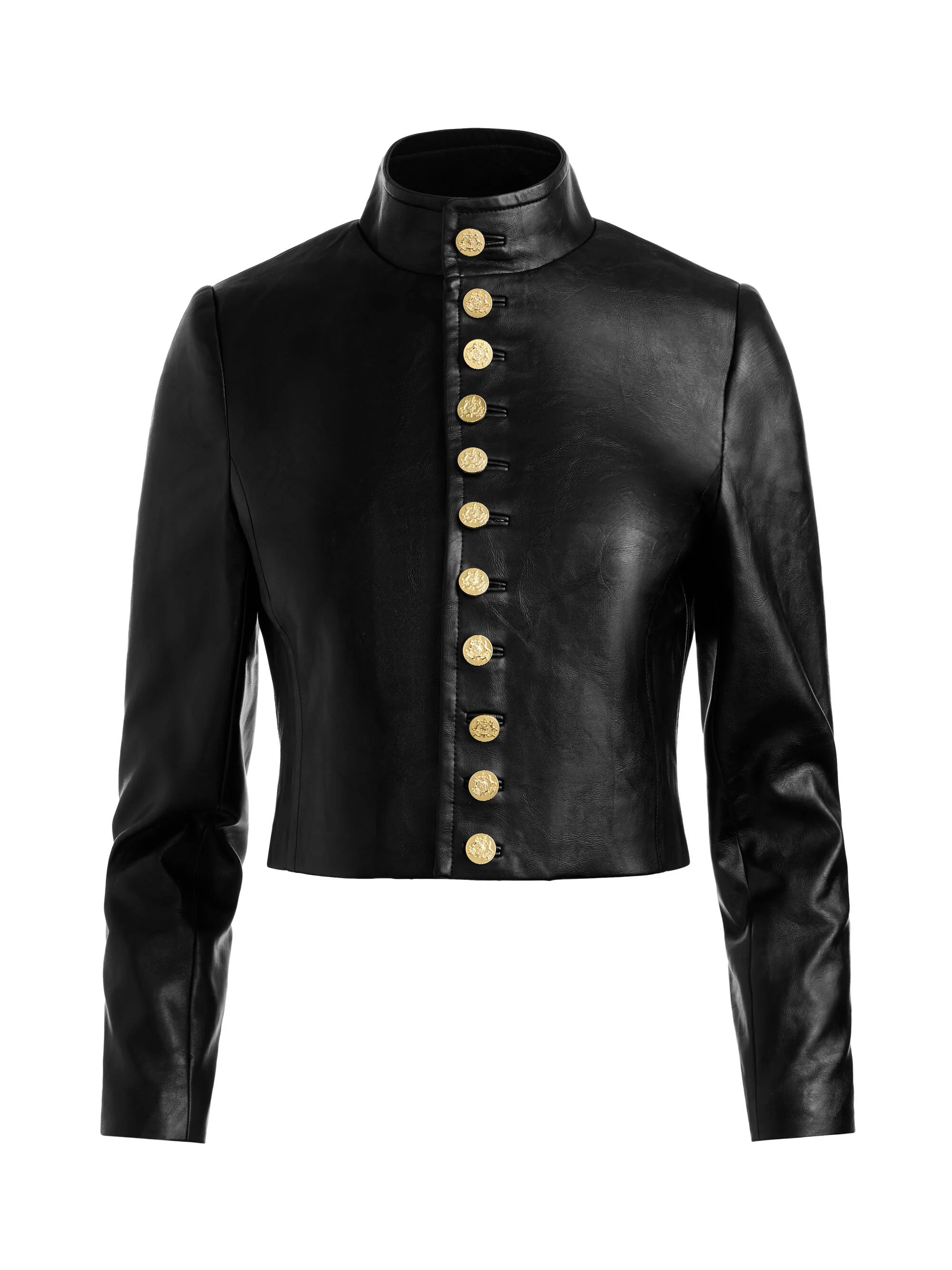 A modern classic. The Emerson jacket is crafted from distressed vegan leather that mimics the lived-in feel of vintage--without sacrificing sustainability or comfort. Structured shoulders, gold buttons, and a cropped cut lend a military feel, while the worn-in texture keeps it cool and effortless. It's the perfect throw-on layer when you want to look polished but not precious. Equal parts strength and style, it's the definition of everyday armor. DETAILS - Military jacket - Distressed vegan leather - Gold button front closures - Cropped - Mock neck - 100% polyurethane - Dry clean only - Imported FIT - Model is 5'10" and wearing a size XS - Length from the shoulder: 18" - Fits true to size, take your normal size