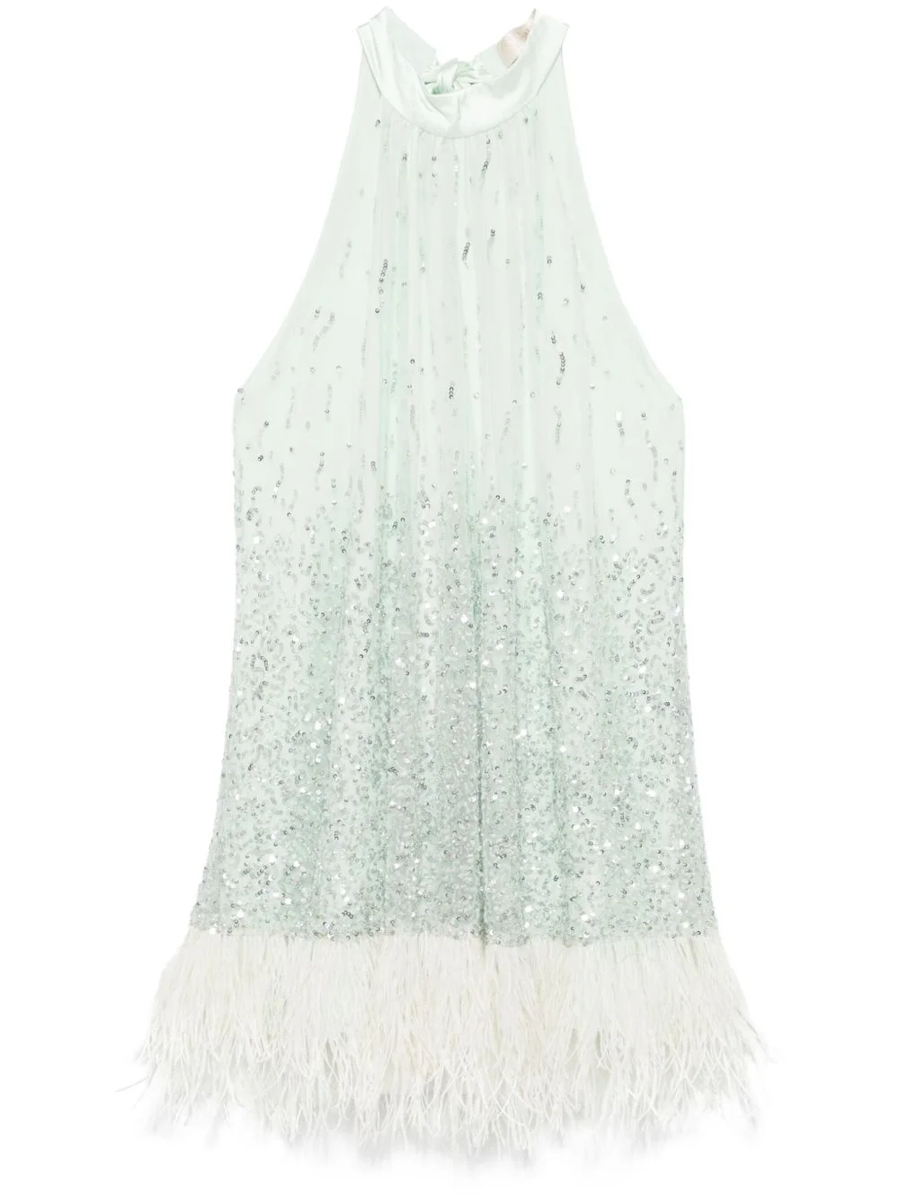 Erna mini dress Highlights - Green - Halterneck - Sequin embellishment - Sleeveless - Feather-trim detailing Imported Composition Outer: Ostrich Feather 100%, Nylon 100% Lining: Recycled Polyester 95%, Elastane 5% SIZE & FIT Model measurements Height 5 ft 10 in(1.78 m) Bust/Chest 33.85 in(86 cm) Hips 36.61 in(93 cm) Waist 26.77 in(68 cm) FittingInformation Designed to be unstructured, offering a loose fit throughout Made from a midweight fabric Washing instructions Specialist Cleaning