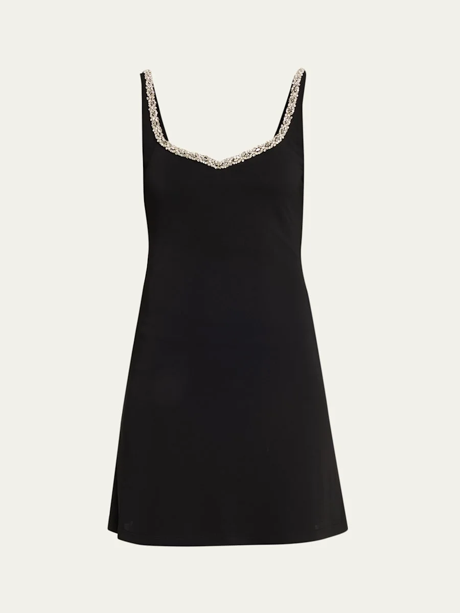 Cut from ultra soft matte jersey, the "Eve" mini dress by Alice + Olivia is finished with crystal-embellished trim and features a sculpted silhouette Approx. 32.5"L from shoulder to hem Sweetheart neckline Sleeveless Hem falls above the knee A-line silhouette Center back zipper Polyester Lining: Nylon Dry clean Imported Online Inquiries: BGS21_T90SS| Store Inquiries: #5499897
