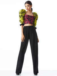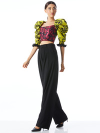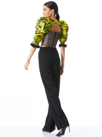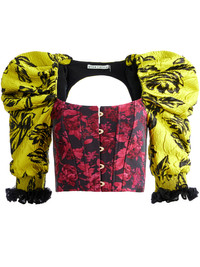 A total statement top, this includes a cropped fit, bustier design, and exaggerated sleeves. And let's talk about those sleeves: They're crafted from 100% pure silk, with chic fringe details and includes the most beautiful print. PRODUCT DETAILS - Crop top - Bustier - Long sleeve - Exaggerated puff sleeves - Open back - Front clasp closure - Total length: 17” - Body: 100% polyester - Sleeves: 100% silk - Fits true to size, take your normal size - Aqua is wearing a size 2 and her measurements are 5’10”, 32” bust, 23” waist, 34” hips - Dry clean only - Imported