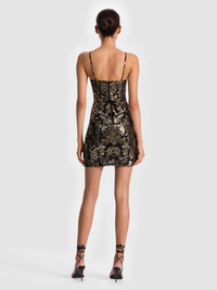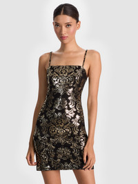 Fifi is the ultimate party dress with a bodycon fit and metallic brocade foil that glimmers against vegan suede. Slim straps and a sleek silhouette keep it minimal, while the shimmering surface makes it unforgettable. Perfect for New Year’s Eve or any night where shine is required, this little dress is made to turn heads. Pair with barely-there sandals to let it truly shine. DETAILS - Mini dress - Metallic brocade foil on vegan suede - Bodycon fit - Back zipper closure - 90% polyester, 10% elastane - Dry clean only - Imported FIT - Model is 5'10" and wearing a size 0 - Length from the shoulder: 32 1/2" - Fits true to size, take your normal size