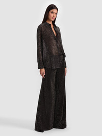 The throw-on-and-go shirt of your dreams just got an upgrade. Our Finely black button-down is back-- this time with a touch of shine. Embellished with heat-set crystals that catch the light at every turn, it’s intentionally oversized for that borrowed-from-the-boys ease. Designed with exaggerated cuffs, a longline hem, and a relaxed drape, it looks just as good tucked in as it does left loose. Wear it solo, paired with denim, or layered open over a tank-- versatile, effortless, and undeniably fun. DETAILS - Embellished button down - Hematite heat-set crystals on georgette - Oversized fit - Collared - Hidden placket - 100% polyester - Dry clean only - Imported FIT - Model is 5'10" and wearing a size XS - Length from the shoulder: 30 1/2" - Runs large, size down for a slimmer fit