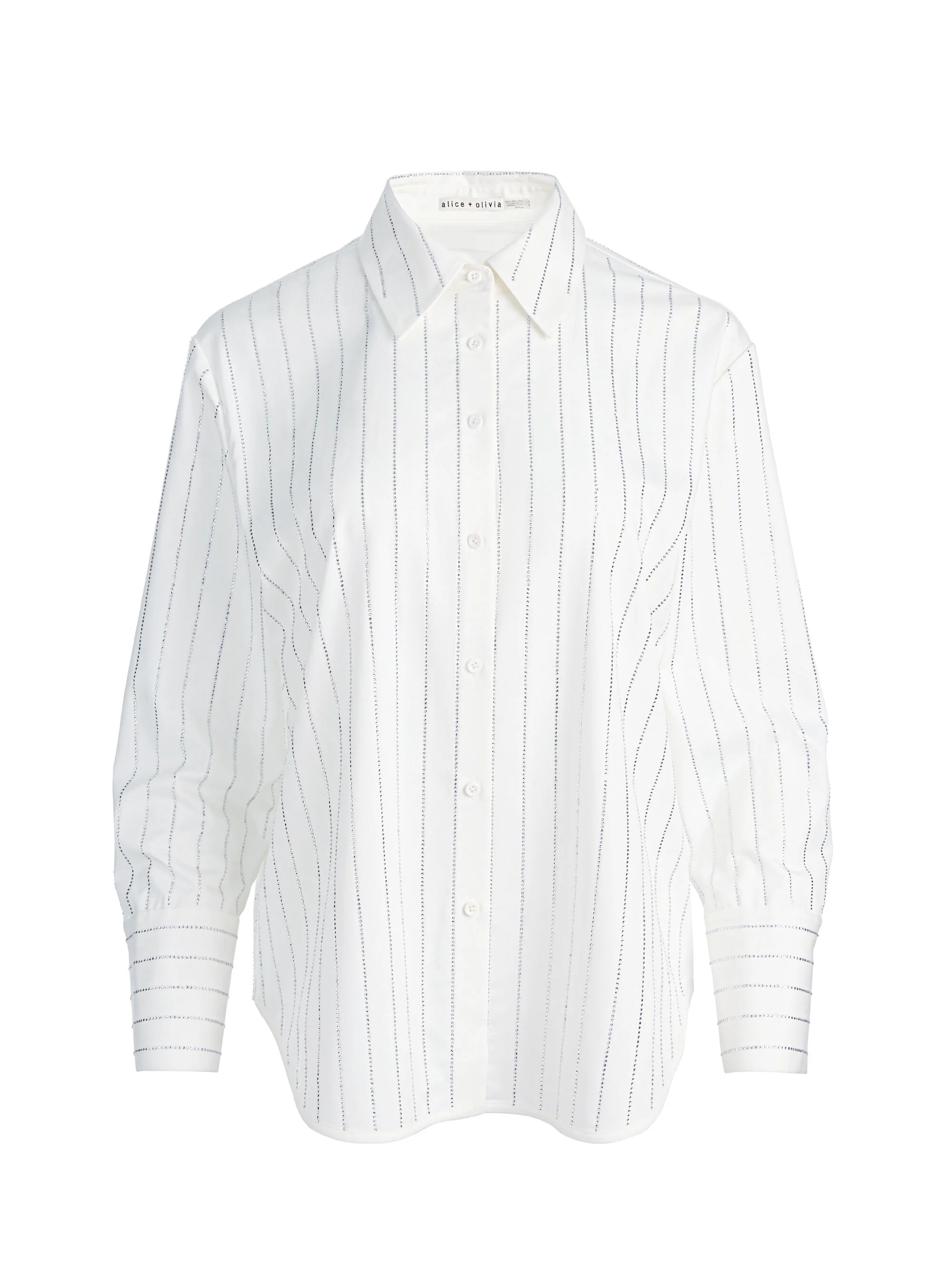 The throw-on-and-go shirt of your dreams. Our Finely embellished button down is intentionally oversized for a borrowed-from-the-boys, effortless feel, while the rhinestone pinstripes keep things feminine. Crafted from a super breathable lightweight twill, it features exaggerated cuffs, a long-line hem, and a relaxed drape that works tucked or untucked. Style it by day with your favorite boyfriend jeans for a relaxed streetwear vibe, then swap in leather pants by night for an elevated cool-girl look. DETAILS - Oversized button down - Lightweight twill - Crystal embellished pinstripes - 65% recycled polyester, 32% viscose, 3% elastane - Dry clean only - Imported FIT - Model is 5'10" and wearing a size XS - Length from the shoulder: 30" - Runs large, size down for a slimmer fit