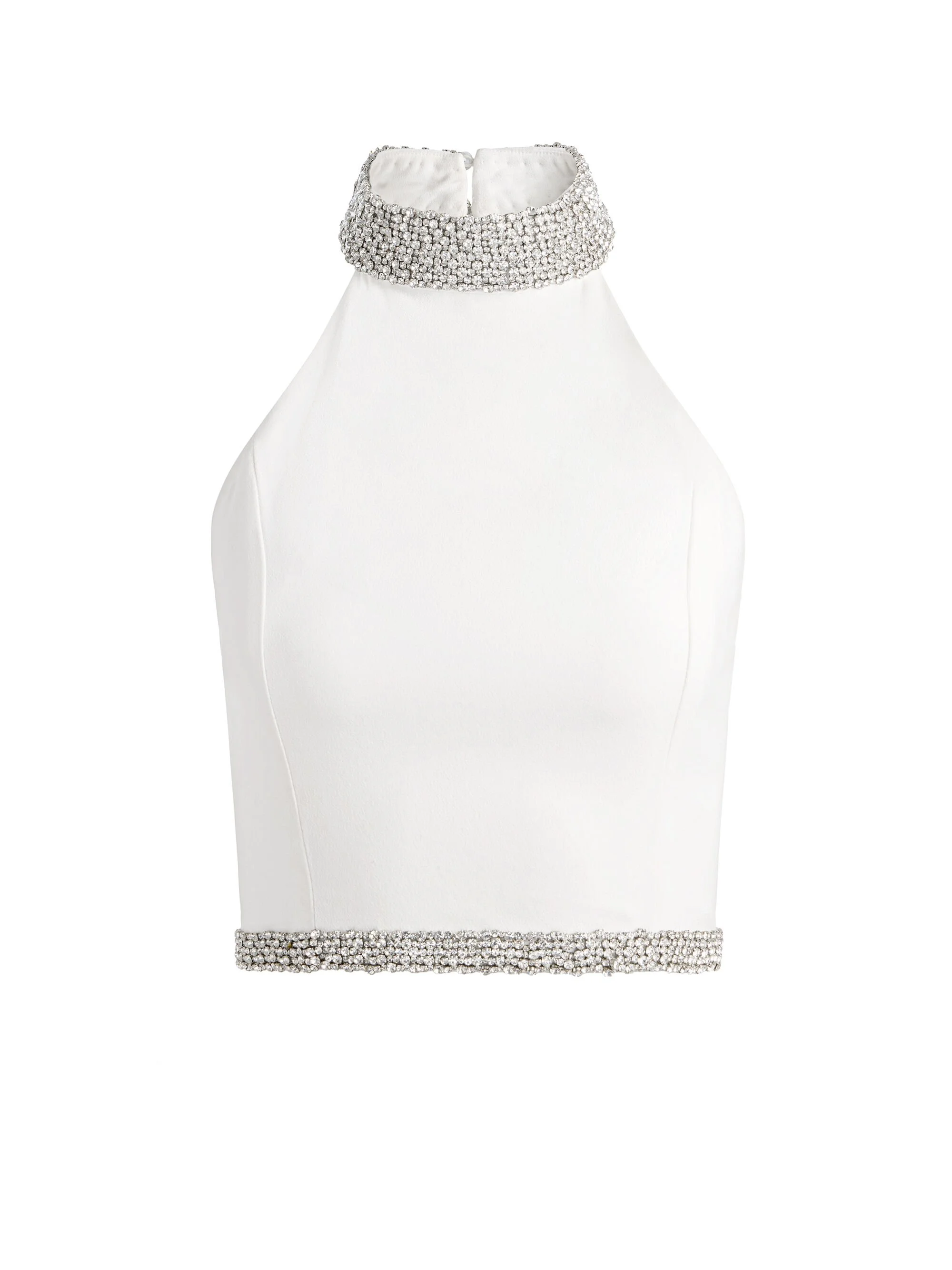 Introducing After Five, our new cocktail dressing collection--because it's 5 o'clock somewhere. Crafted from recycled matte satin crepe, our Gatz top stuns with a sculptural mock neck, a daring open back, and delicate crystal embellishments tracing the neck and hem. Its cropped cut adds a sexy touch, while the high neckline keeps things feeling polished. A true statement-maker--dress her up or down, she's ready for anything. DETAILS - Crop top - Recycled matte satin crepe - Crystal embellished trim - Open back - Mock neck - Smocked back with zipper closure - 62% recycled polyester, 36% polyester, 2% elastane - Dry clean only - Imported FIT - Model is 5'10" and wearing a size 0 - Length from the shoulder: 17 1/2" - Fits true to size, take your normal size