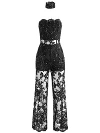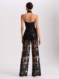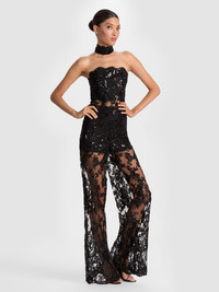 Truly gasp-inducing, Georgie is back by popular demand! This season she’s reimagined in a jumpsuit that feels flirty and fresh. Her floral lace is intricately hand-embroidered with sequins, creating depth and shimmer in every detail. A detachable choker collar adds a playful, coordinated finish. With its fitted bodice and long wide legs, this jumpsuit is made for holiday soirees where you need to turn heads. DETAILS - Jumpsuit - Floral embroidered sequin beaded lace - Attached lining - Detachable choker - Back zipper closure - 100% polyester - Dry clean only - Imported FIT - Model is 5'10" and wearing a size 0 - Length from the shoulder: 59" - Inseam: 32" - Fits true to size, take your normal size