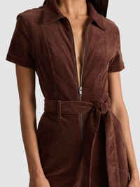 True to its name, this jumpsuit is all about flattery. It's cut for a body-skimming fit with a plunging neckline, defined waist, and sweeping wide-leg silhouette. The cut is tailored yet fluid, giving you movement without sacrificing shape. Made in rich, chocolatey corduroy-it’s both striking and seasonally perfect. Wear it everywhere and anywhere. DETAILS - Corduroy jumpsuit - Wide leg - Short sleeve - Front zipper closure - Adjustable tie waist - 98% cotton, 2% polyurethane - Dry clean only - Imported FIT - Model is 5'10" and wearing a size 25 - Length from the shoulder: 61 1/2" - Fits true to size, take your normal size